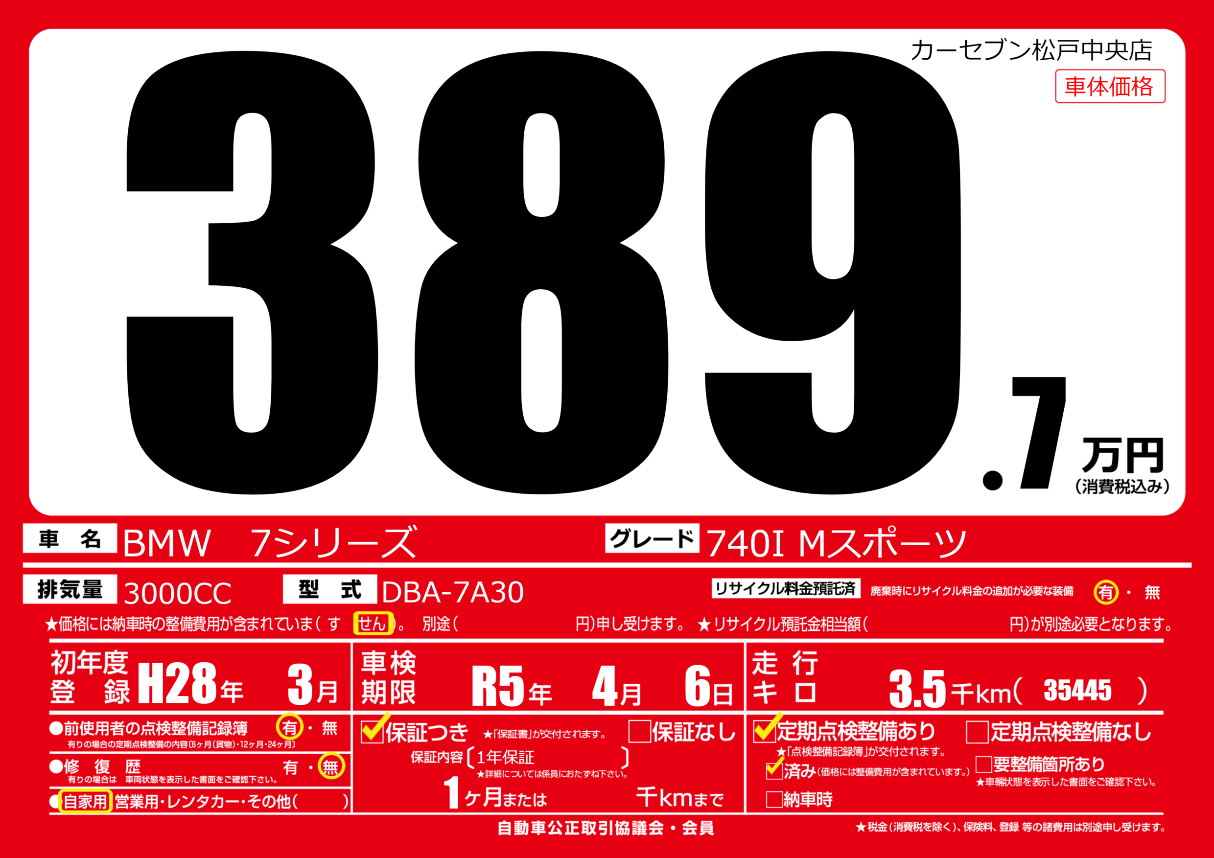 | 車名 | BMW 7シリーズ | グレード ミッション 排気量 |
