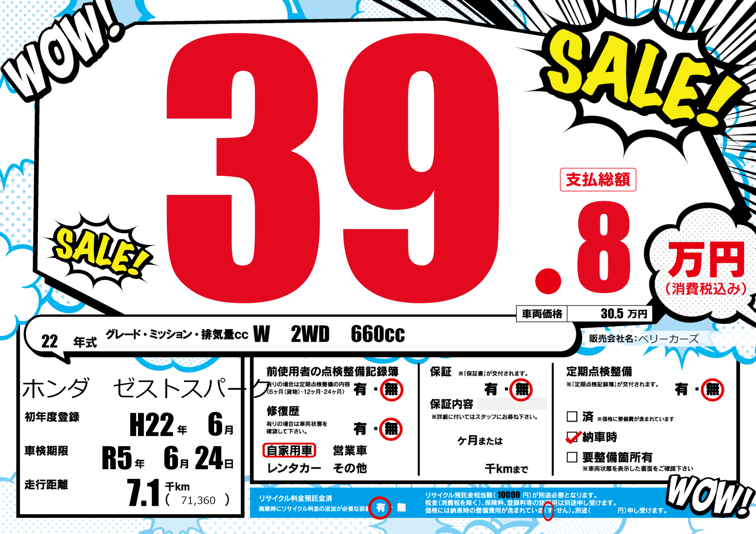| 走行キロ | 0.7万km | 初年度登録 | H22年6月 |