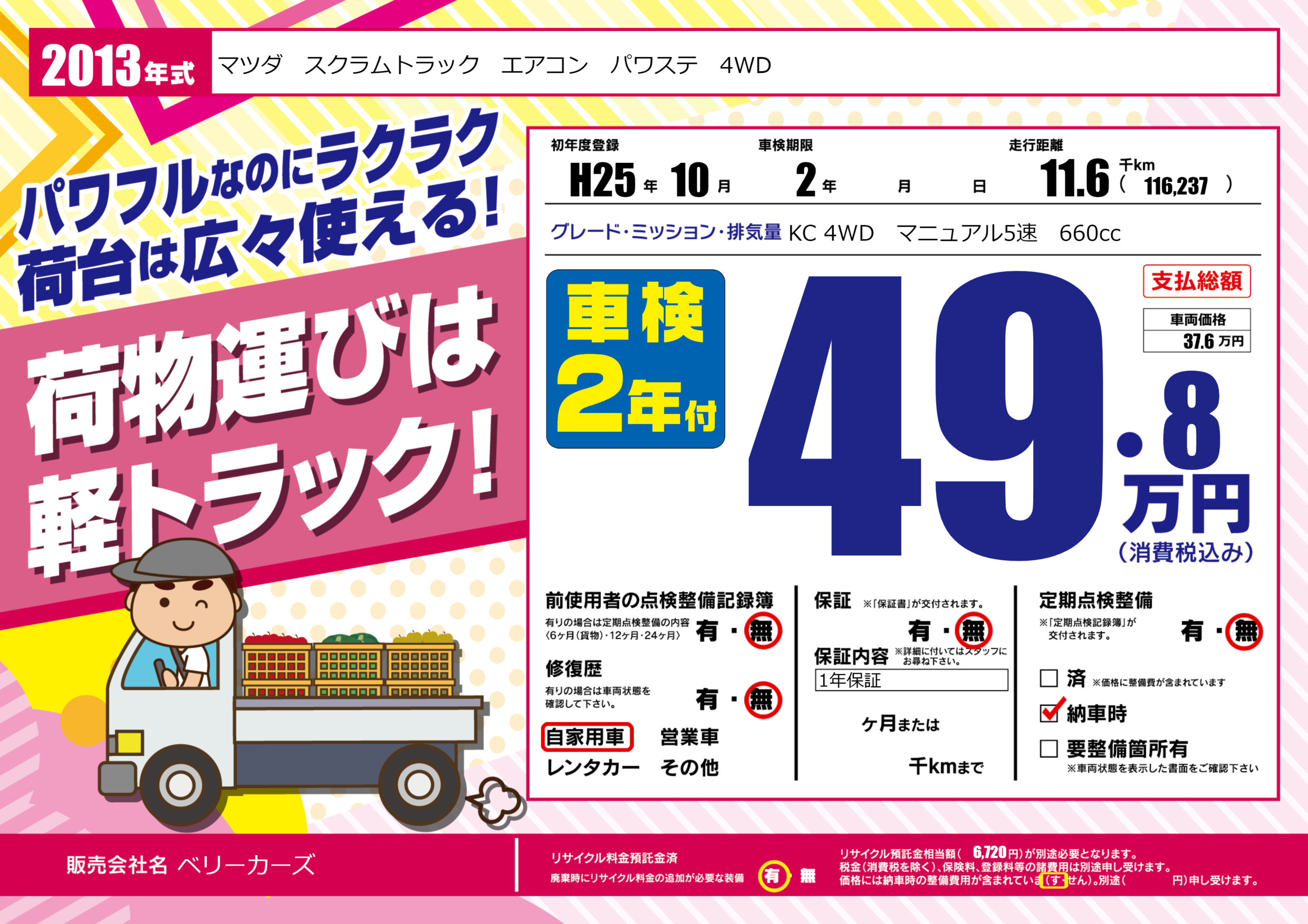 | 車名 | マツダ スクラムトラック エアコン パワステ 4WD | グレード ミッション 排気量 |