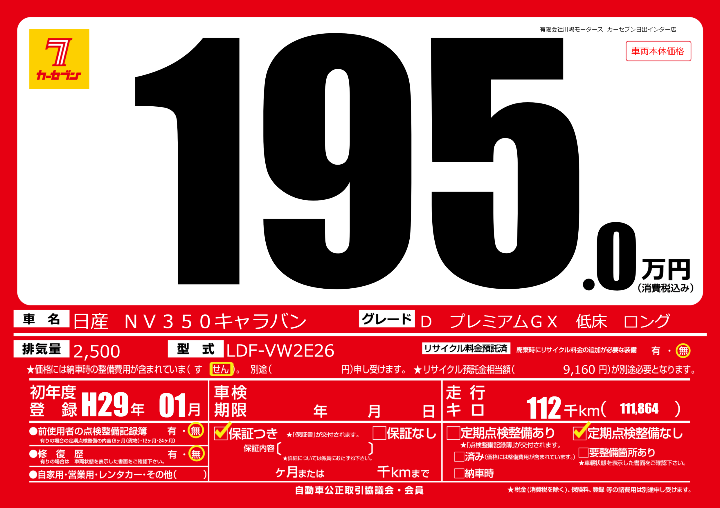 | 車名 | 日産 NV350キャラバン | グレード ミッション 排気量 |
