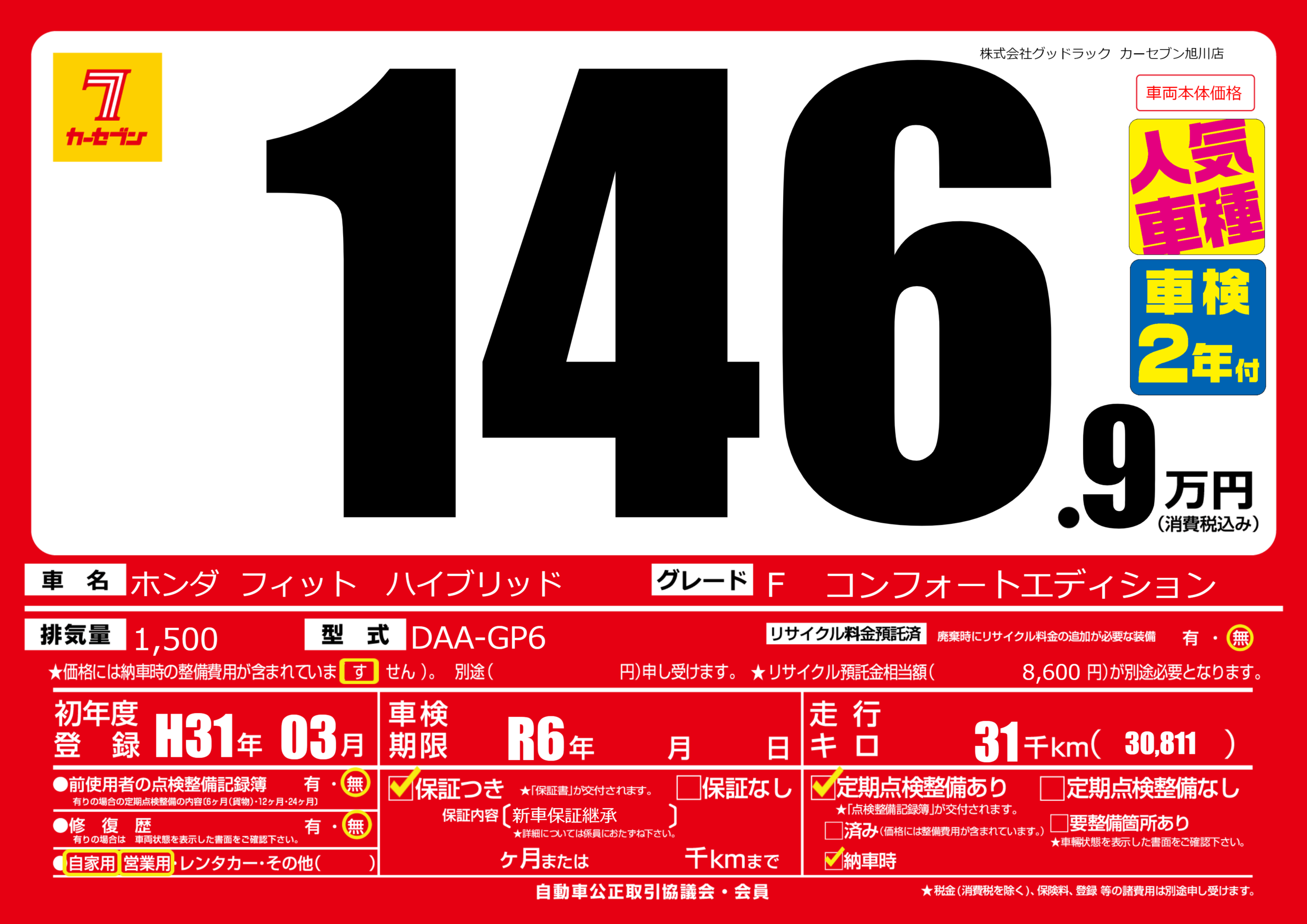| 走行キロ | 3.1万km | 初年度登録 | H31年03月 |