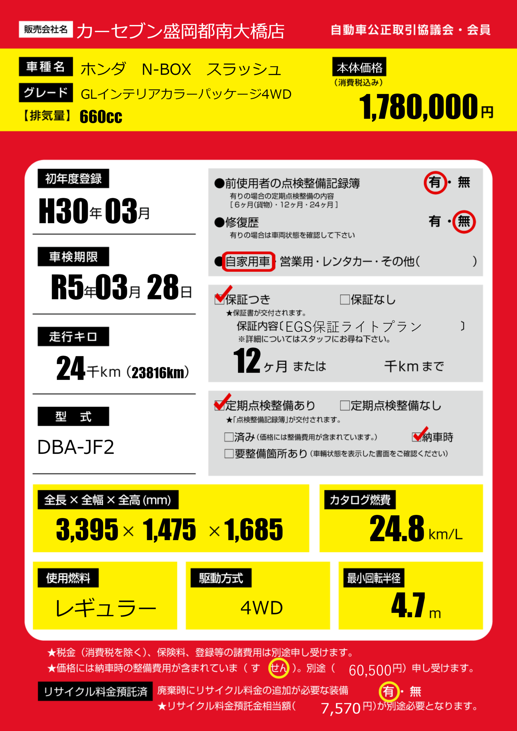 | 車名 | ホンダ N-BOX スラッシュ | グレード ミッション 排気量 |