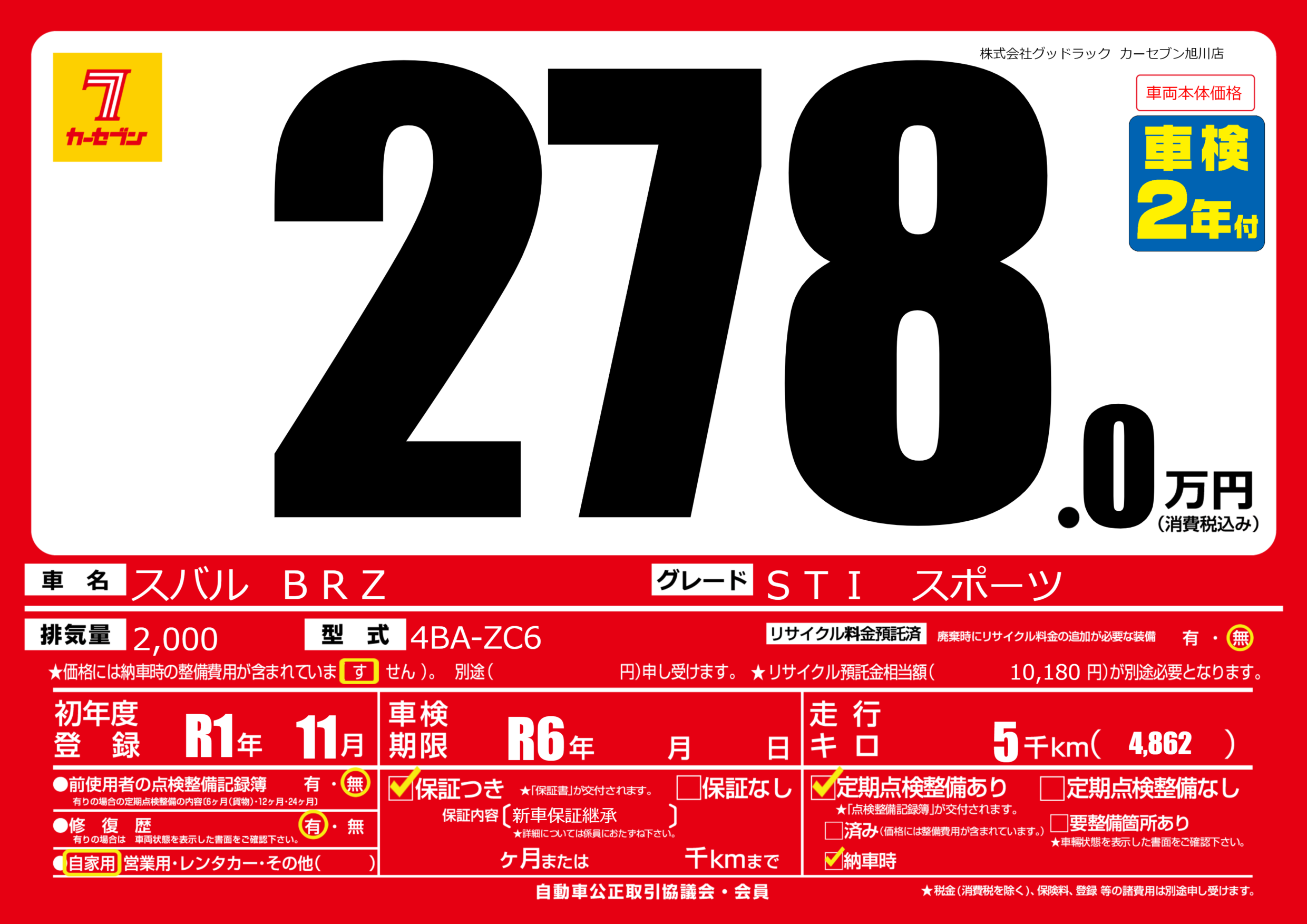 | 車名 | スバル BRZ | グレード ミッション 排気量 |