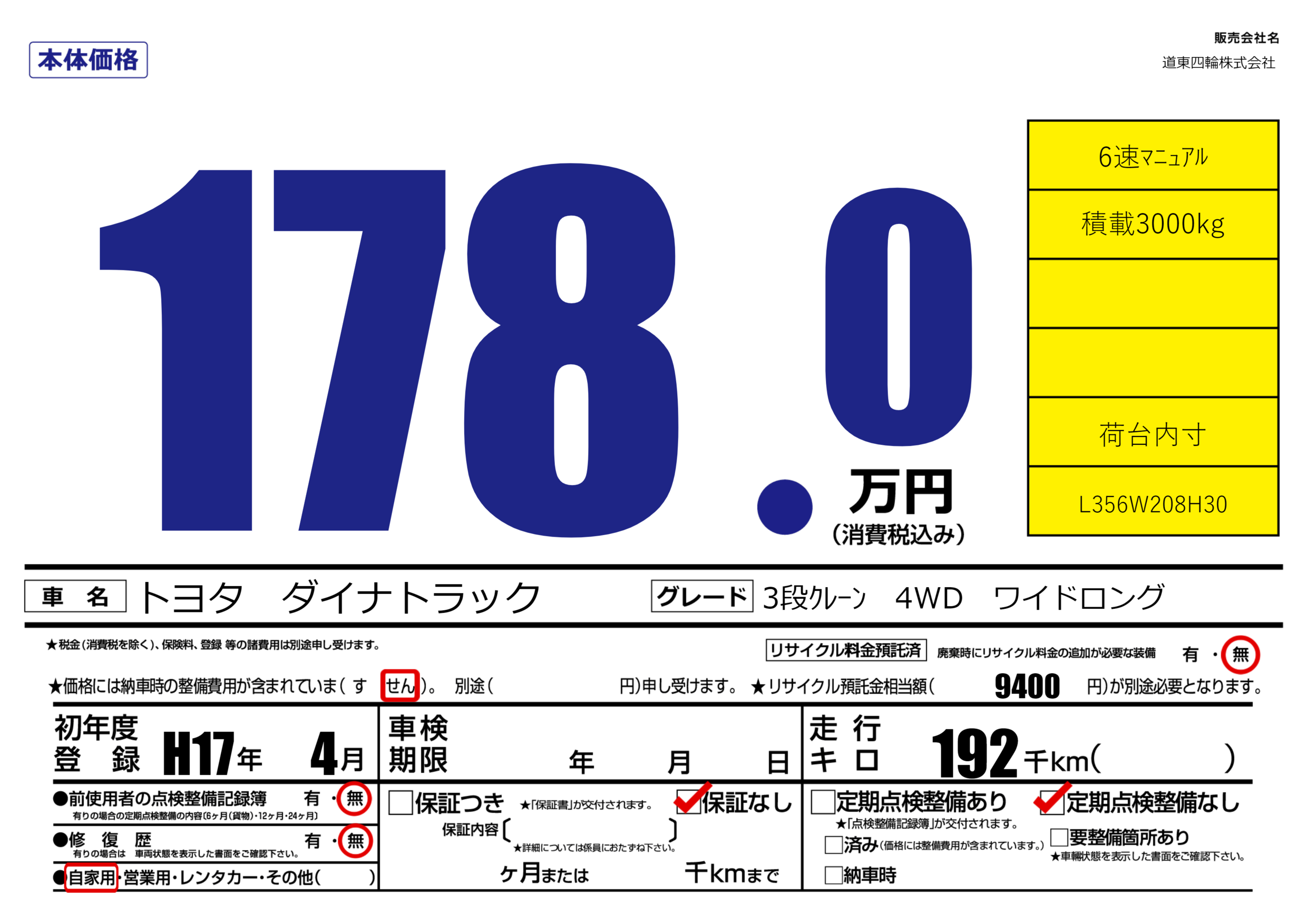 | 車名 | トヨタ ダイナトラック | グレード ミッション 排気量 |