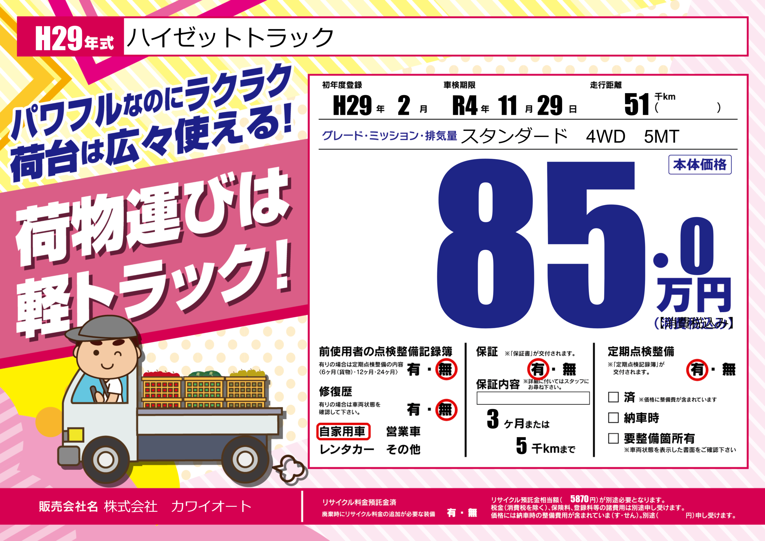 | 車名 | ハイゼットトラック | グレード ミッション 排気量 |
