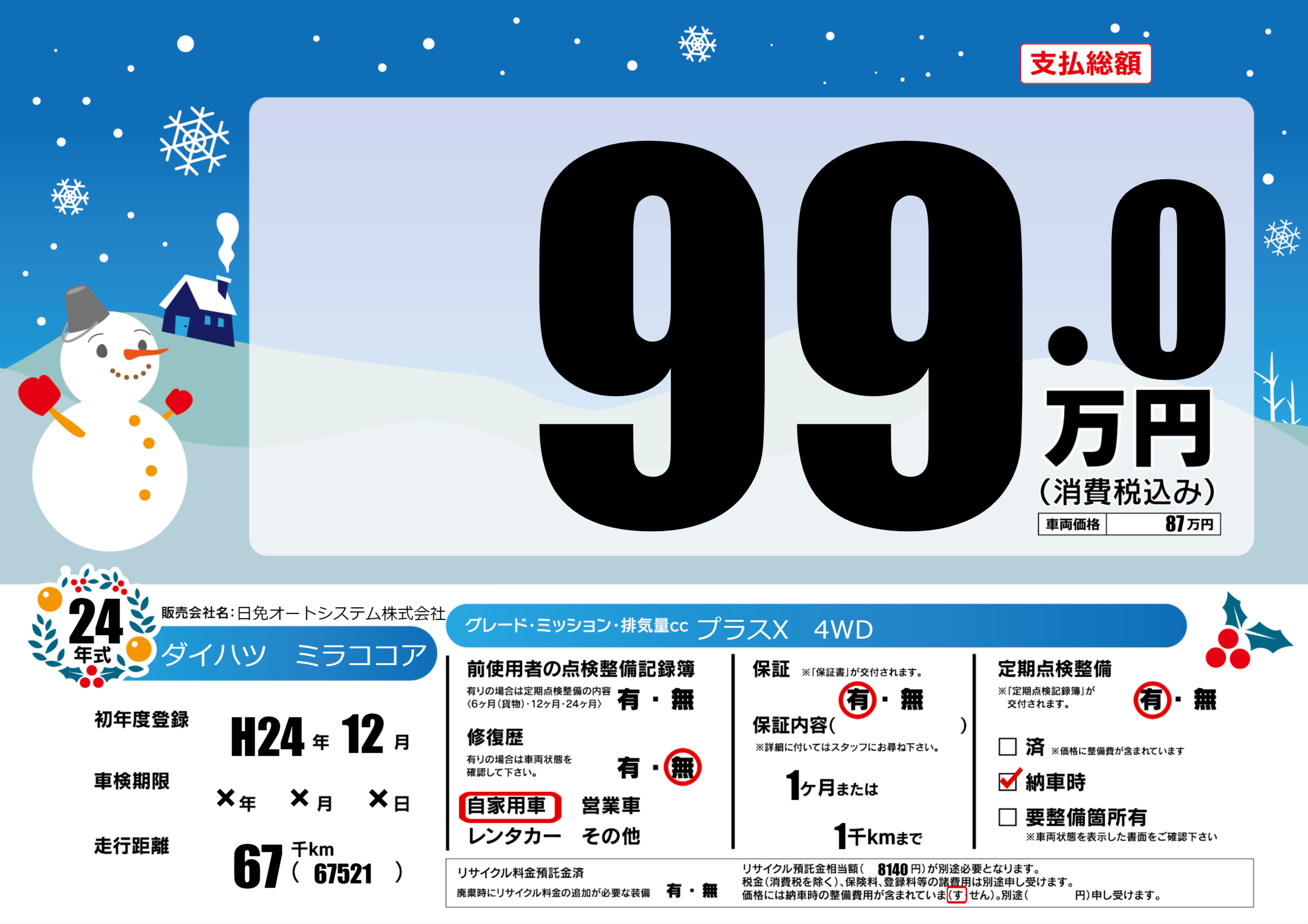 | 定期点検整備 | 定期点検整備あり 納車時あり | ||