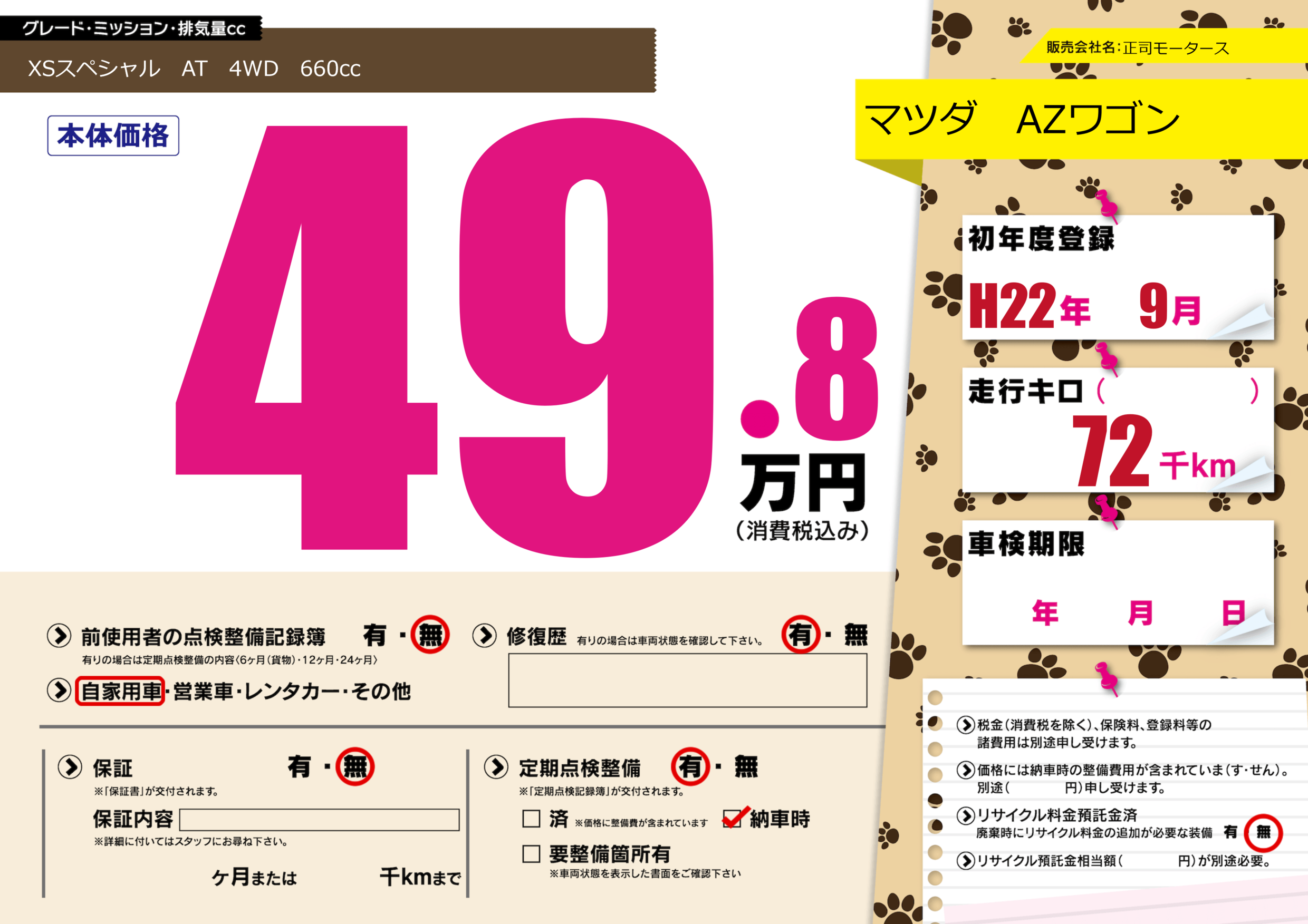 | 車名 | マツダ AZワゴン | グレード ミッション 排気量 |