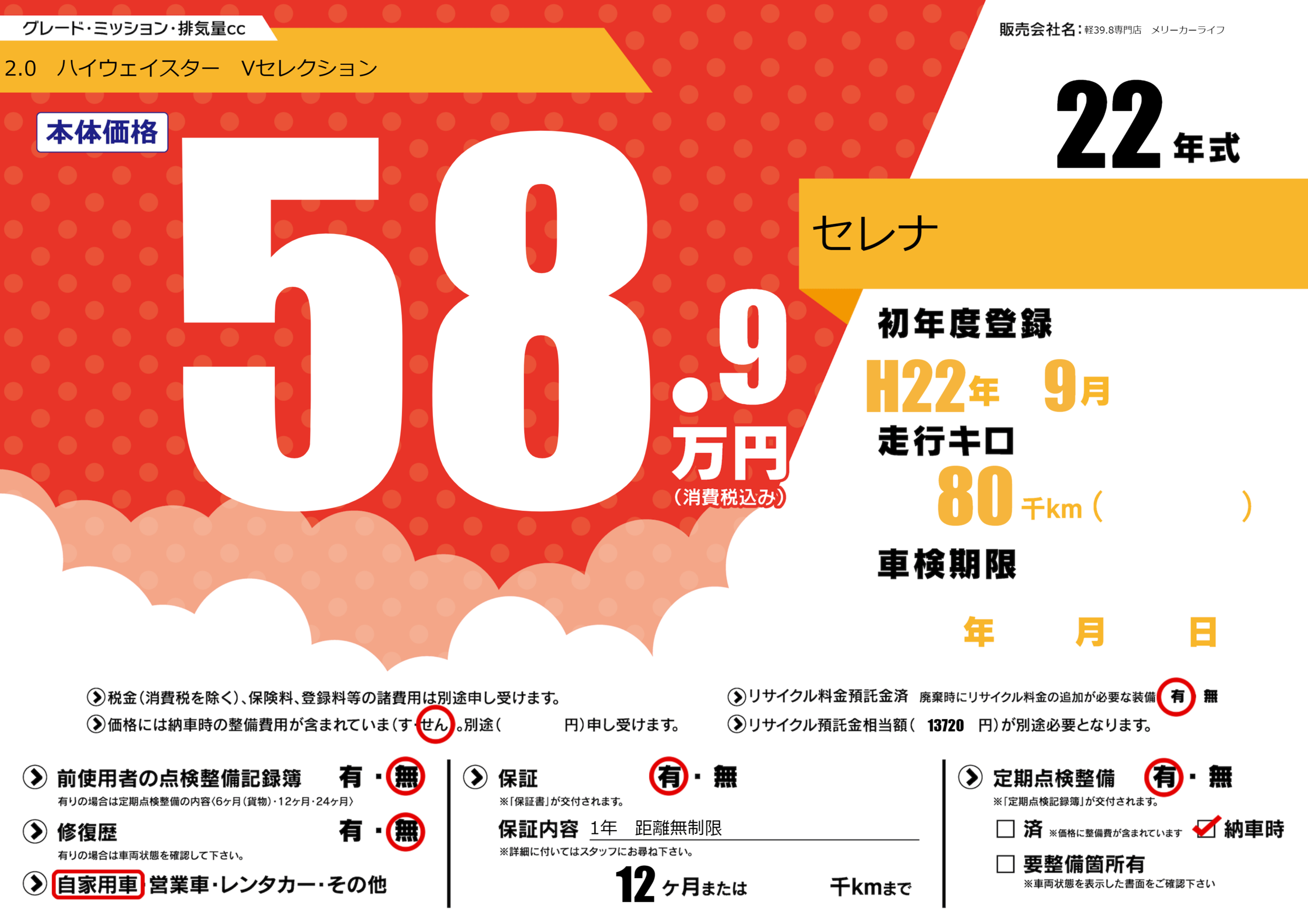 | 定期点検整備 | 定期点検整備あり 納車時あり | ||