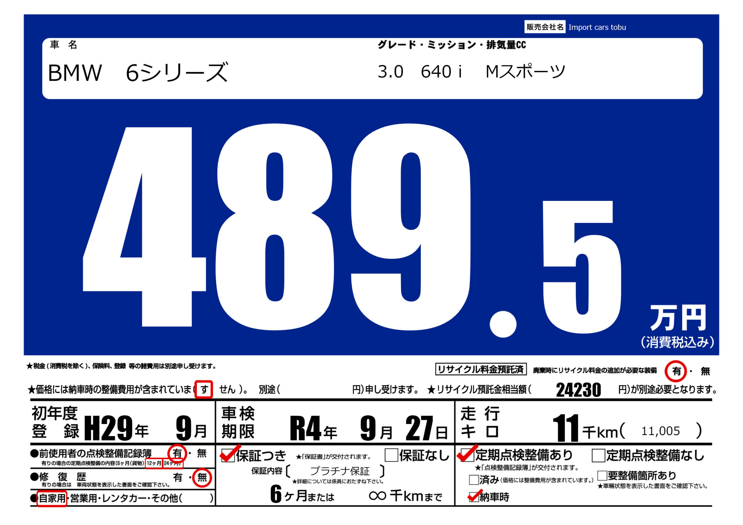 | 車名 | BMW 6シリーズ | グレード ミッション 排気量 |