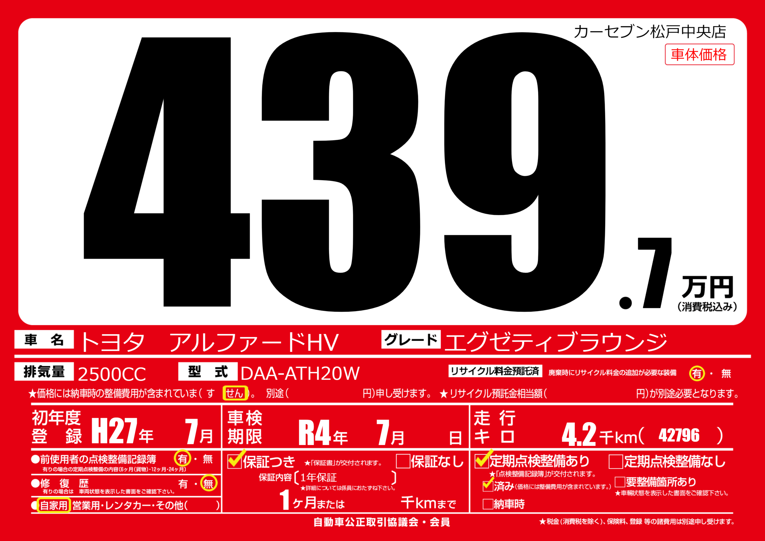 | 車名 | トヨタ アルファードHV | グレード ミッション 排気量 |