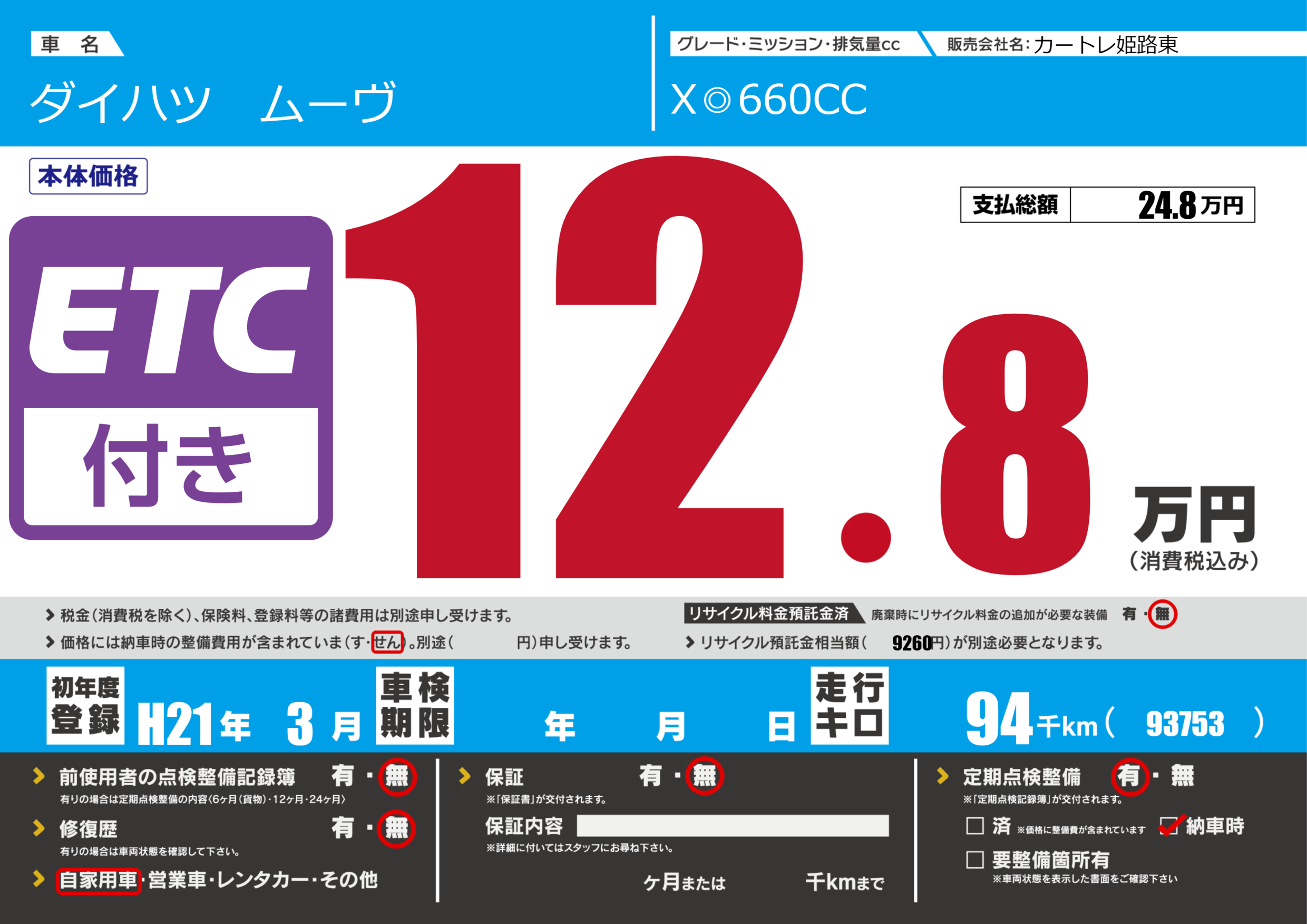 | 定期点検整備 | 定期点検整備あり 納車時あり | ||