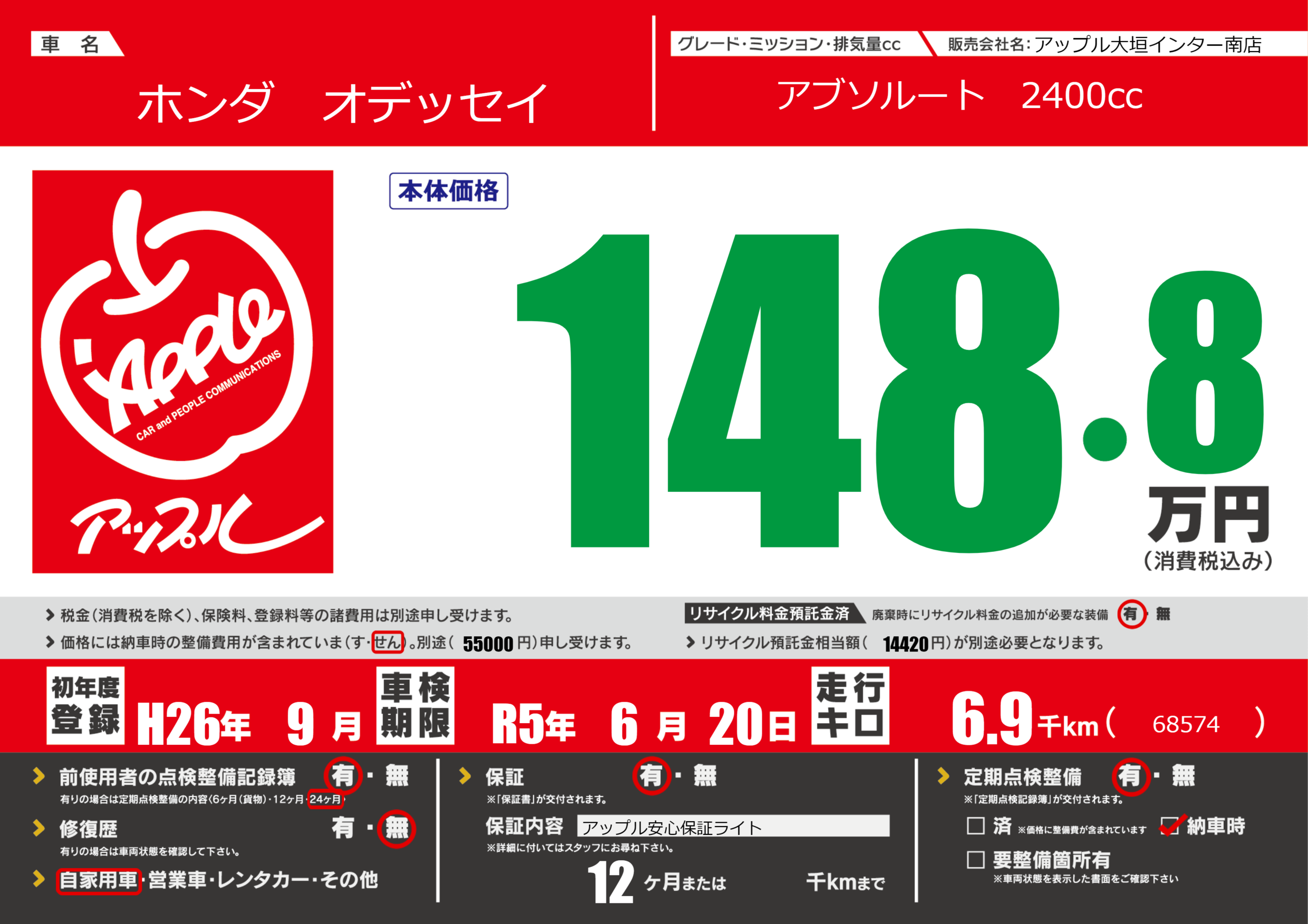 | 走行キロ | 0.6万km | 初年度登録 | H26年9月 |