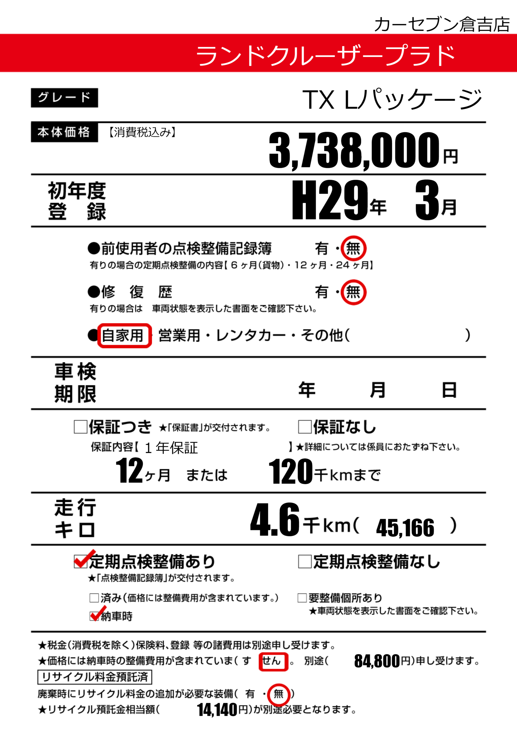 | 車名 | ランドクルーザープラド | グレード ミッション 排気量 |