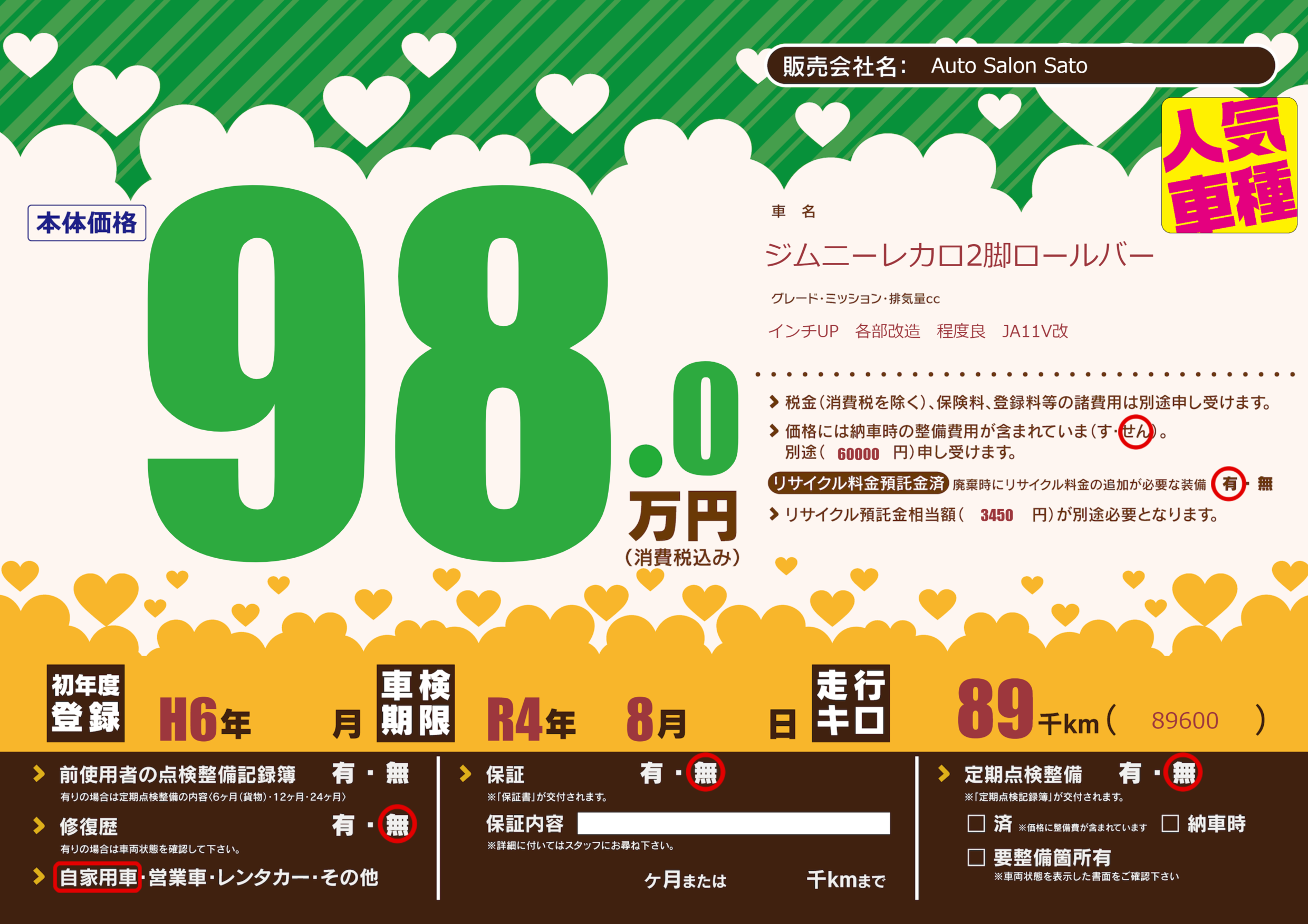 | 車名 | ジムニーレカロ2脚ロールバー | グレード ミッション 排気量 |