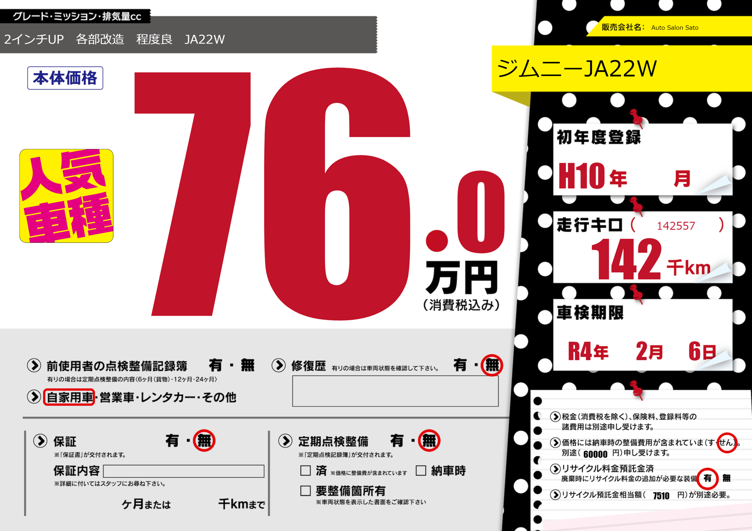 | 車名 | ジムニーJA22W | グレード ミッション 排気量 |