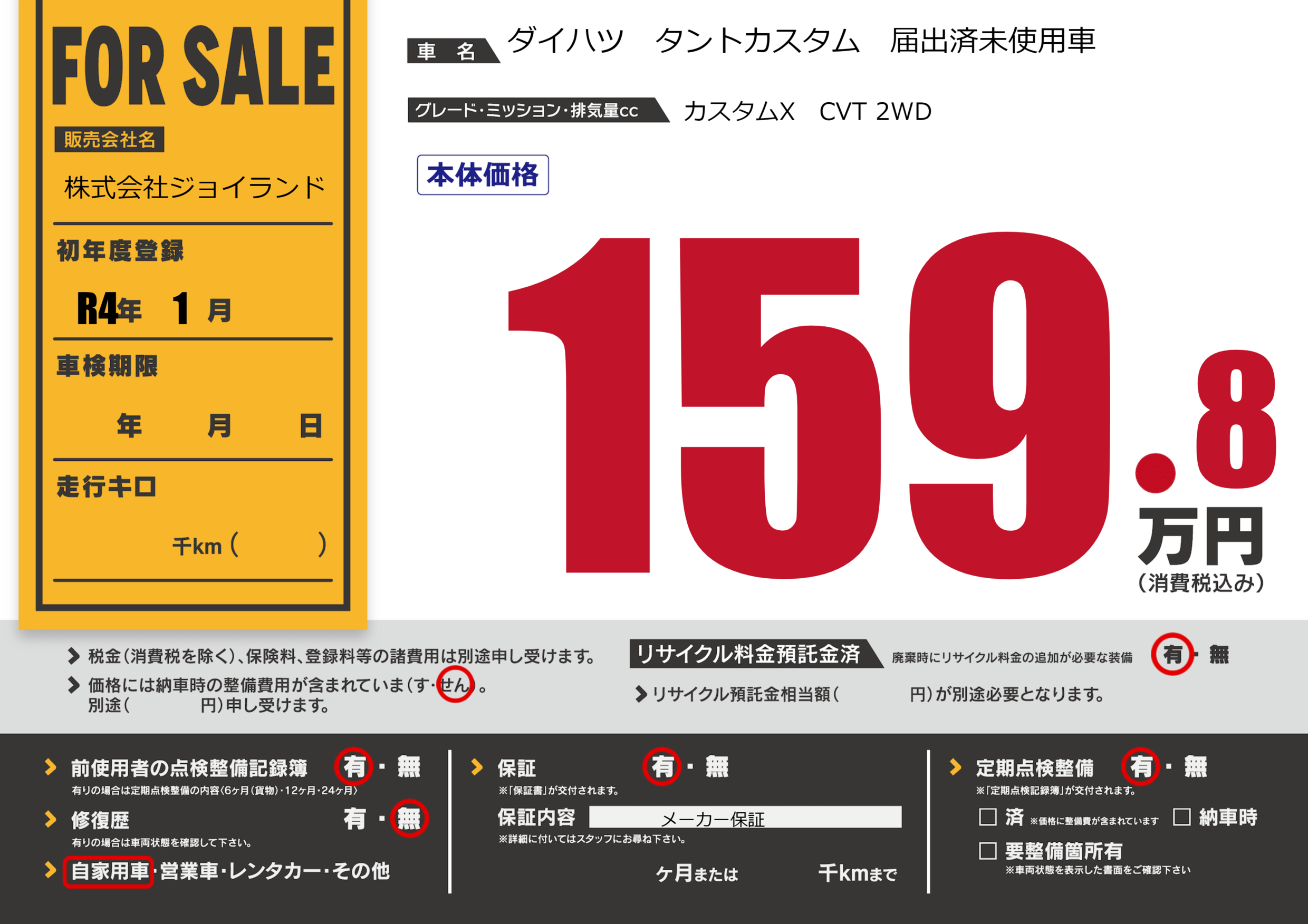 | 車名 | ダイハツ タントカスタム 届出済未使用車 | グレード ミッション 排気量 |