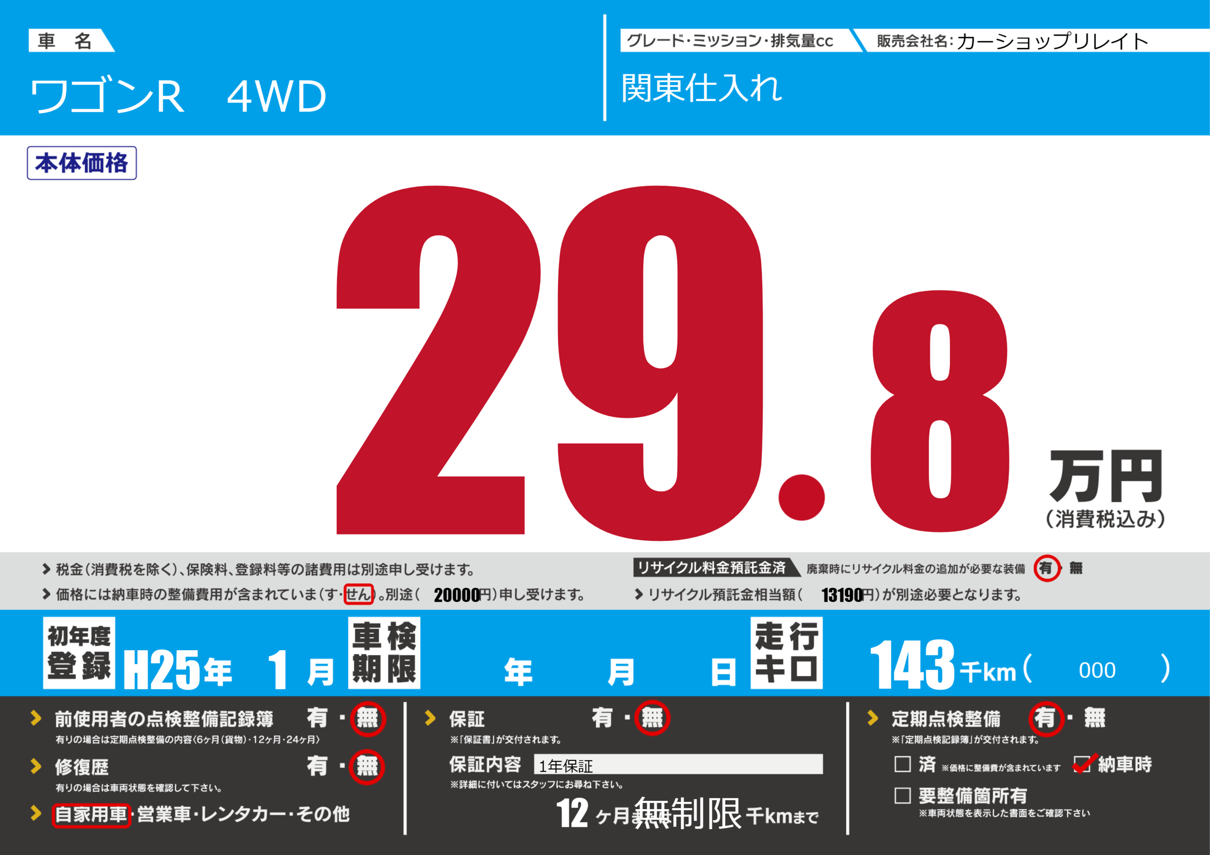 | 車名 | ワゴンR 4WD | グレード ミッション 排気量 |
