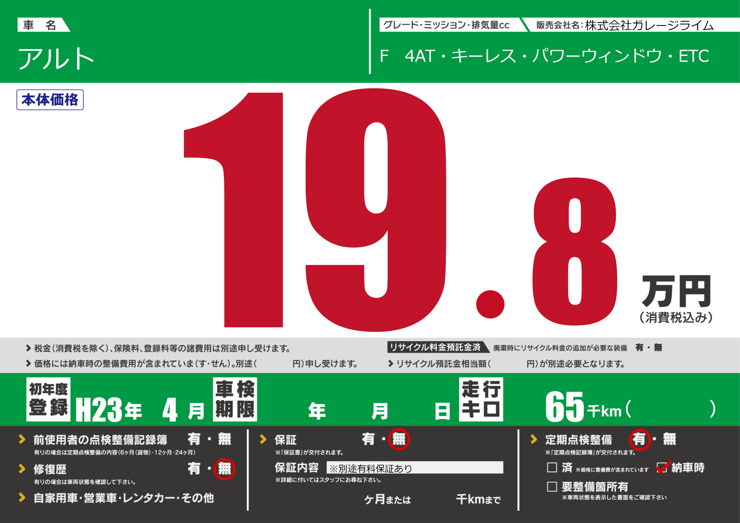 保証なし 保証内容(※別途有料保証あり) ---ヶ月または()千kmまで |
