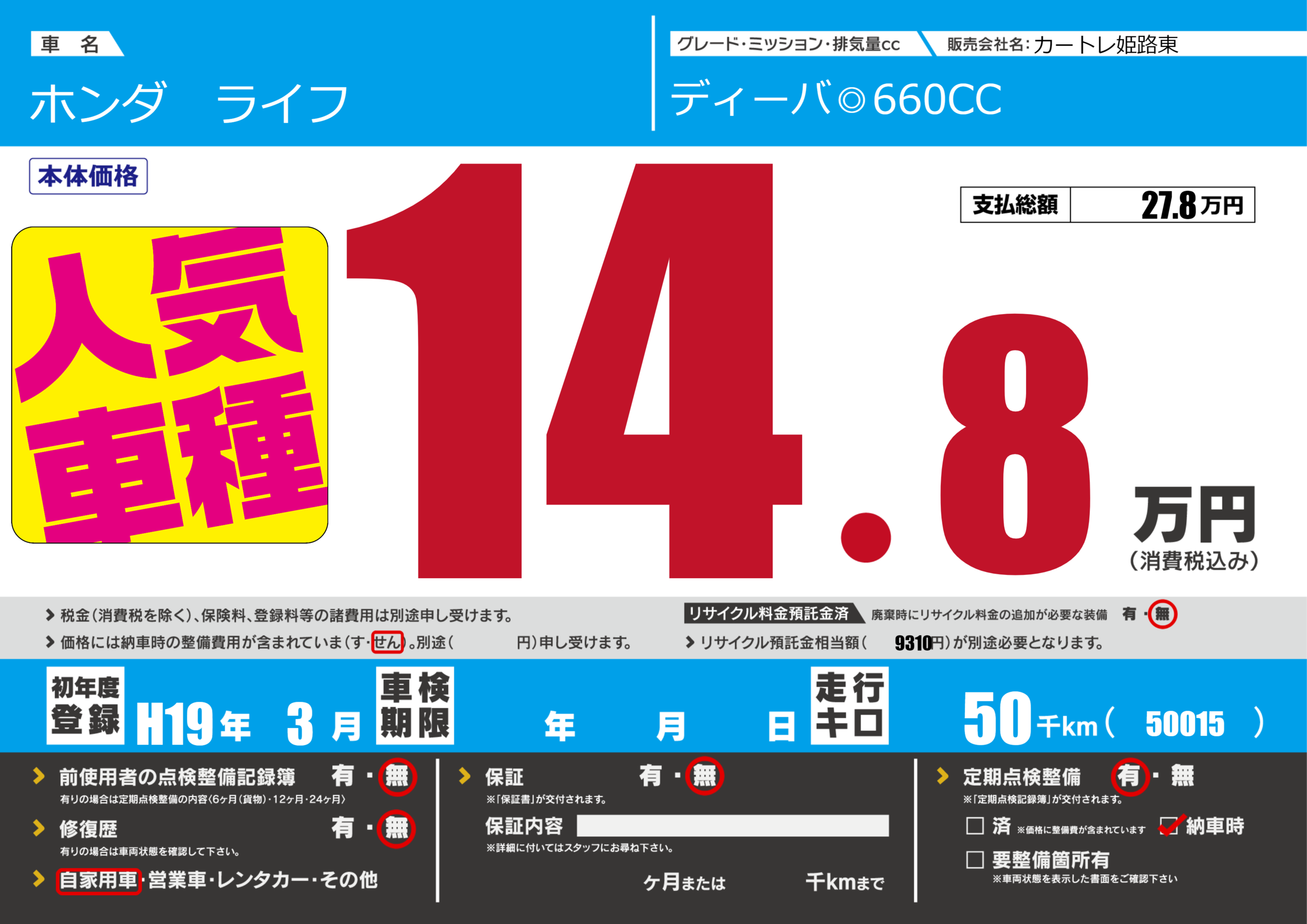 | 走行キロ | 5万km | 初年度登録 | H19年3月 |