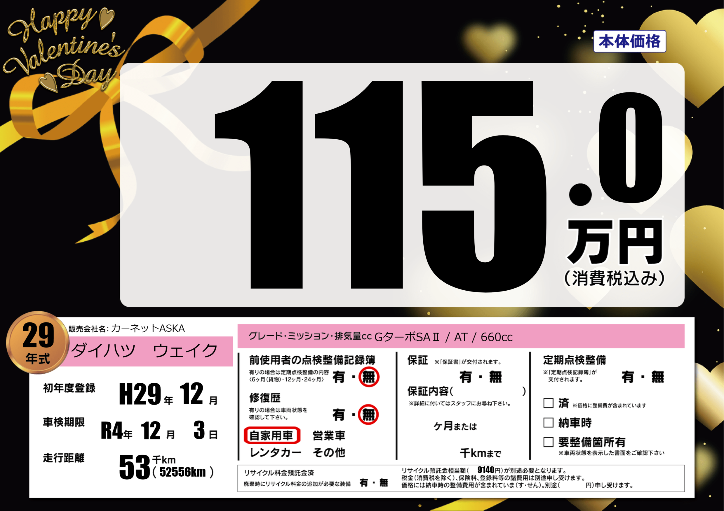| 車名 | ダイハツ ウェイク | グレード ミッション 排気量 |