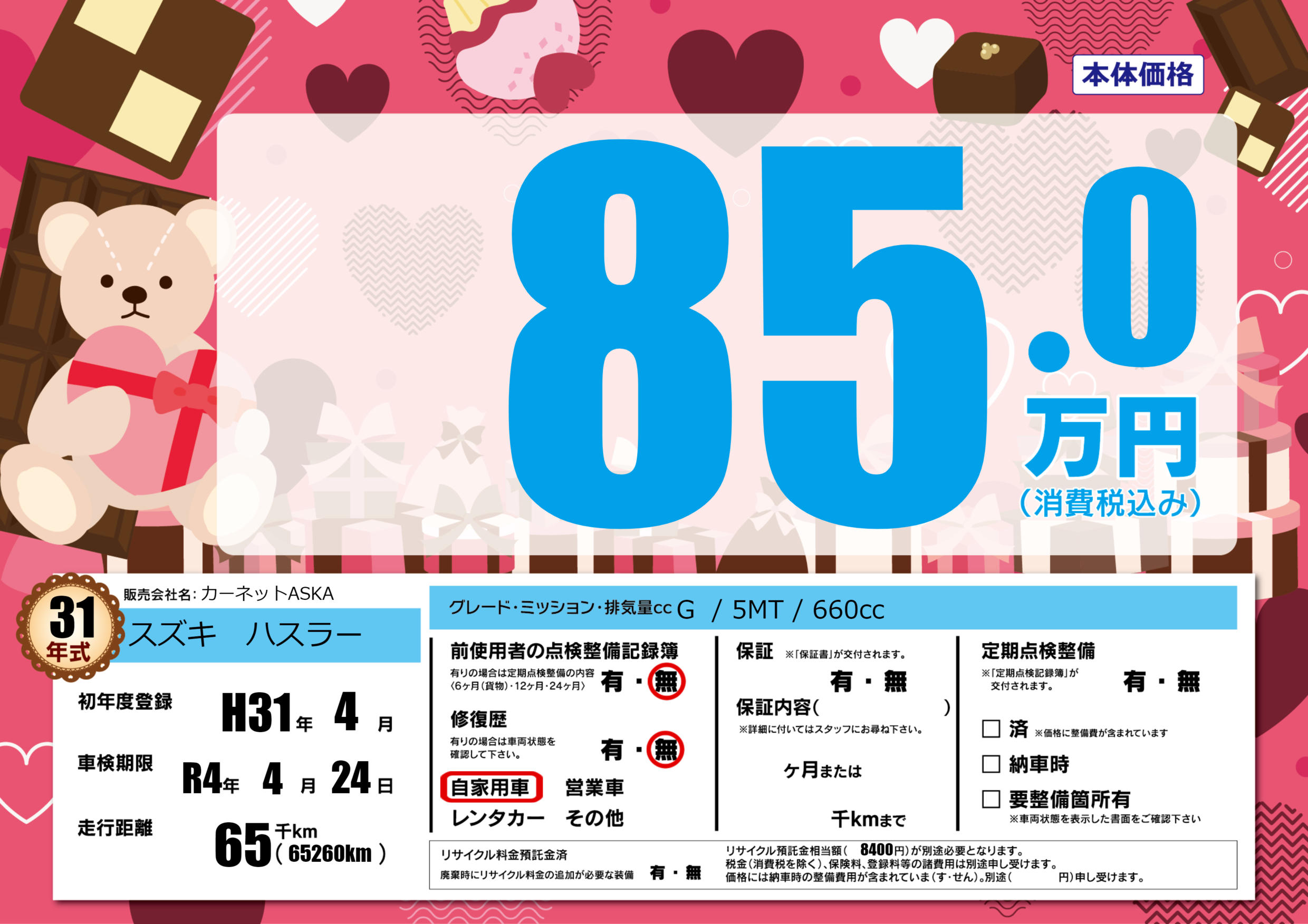 | 車名 | スズキ ハスラー | グレード ミッション 排気量 |