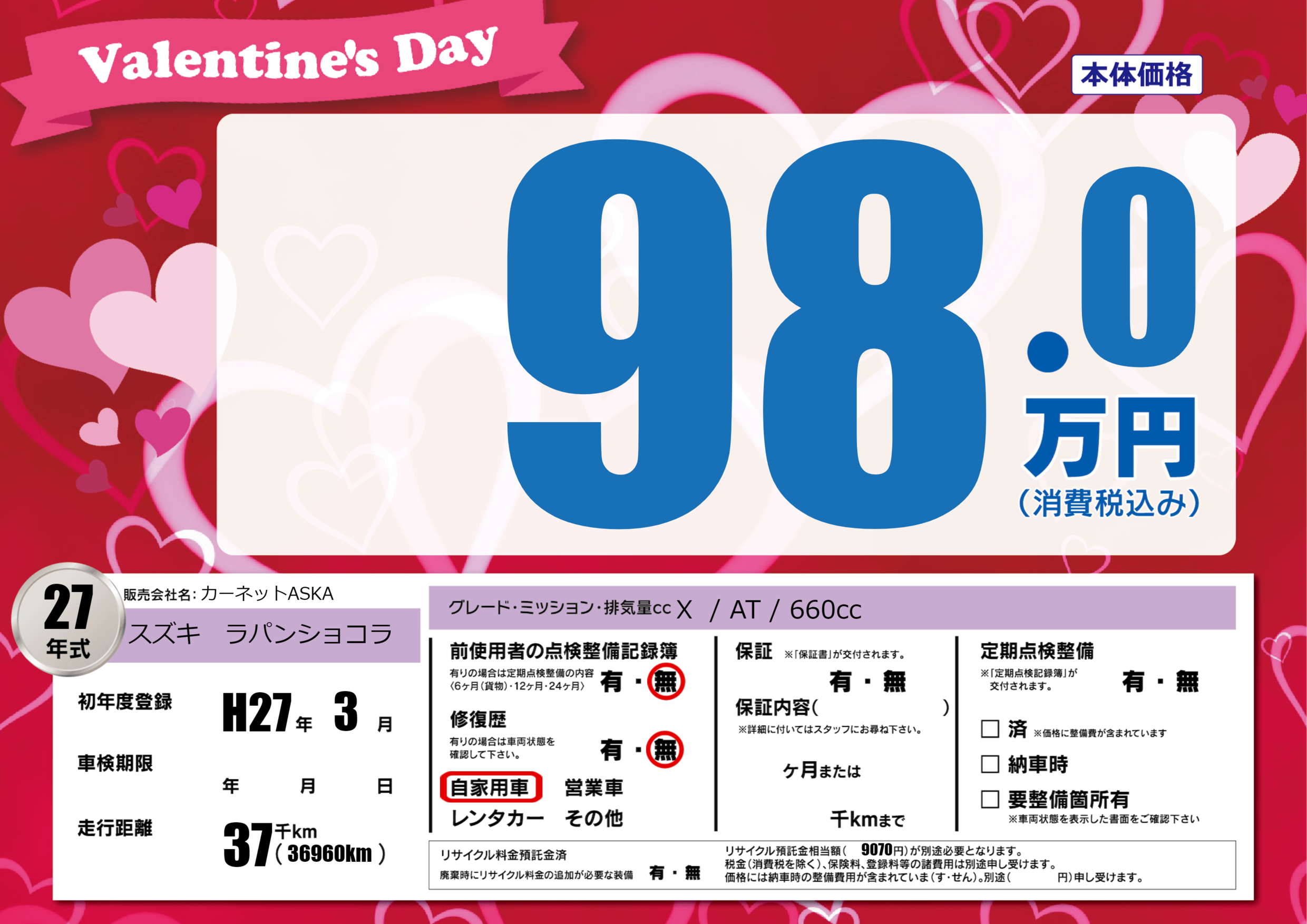 | 走行キロ | 3.7万km | 初年度登録 | H27年3月 |