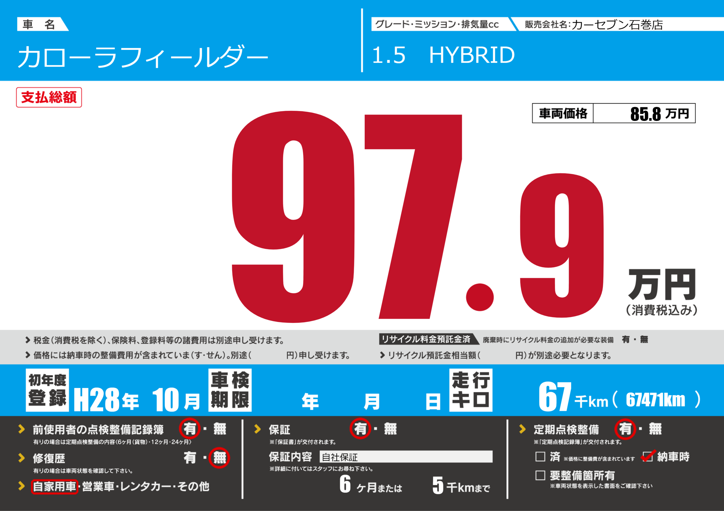 保証付き 保証内容(自社保証) 6ヶ月または(5)千kmまで |