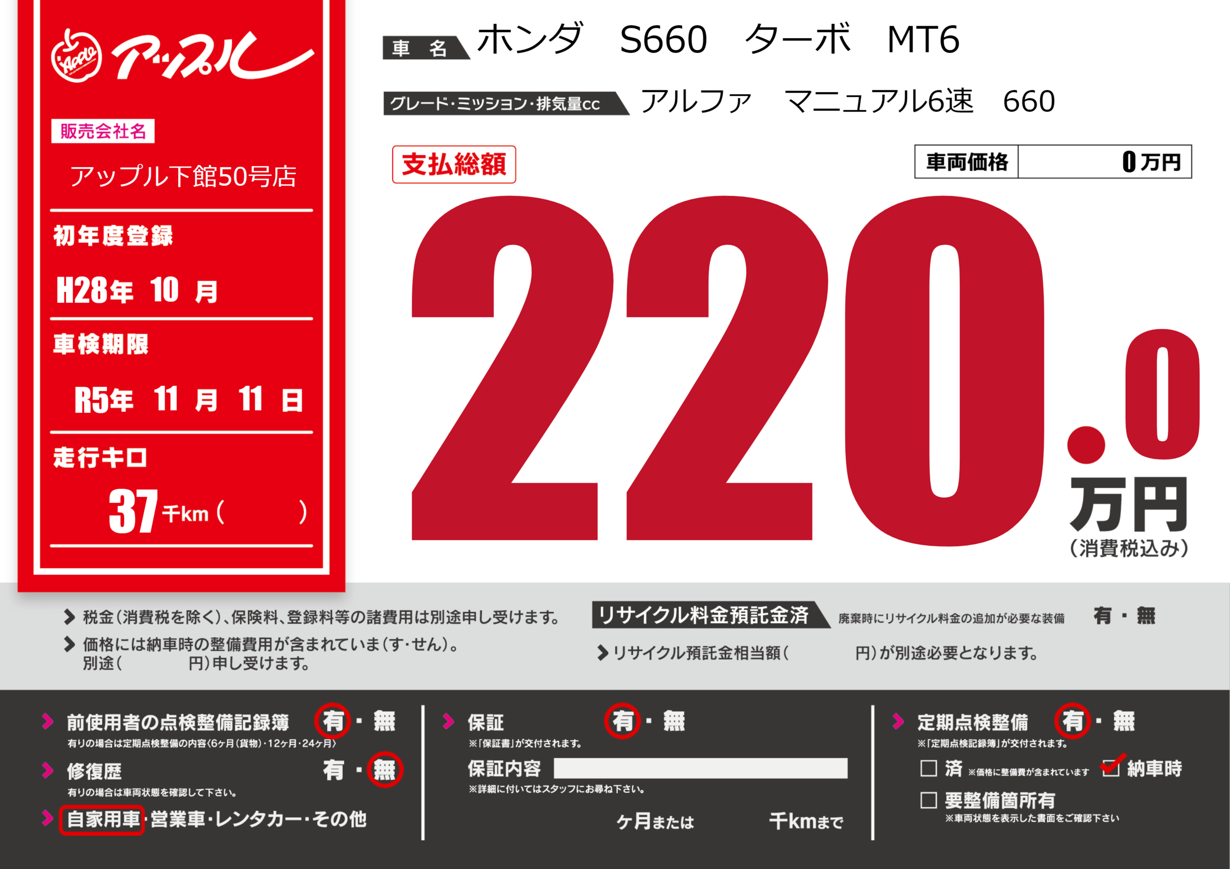 | 車名 | ホンダ S660 ターボ MT6 | グレード ミッション 排気量 |