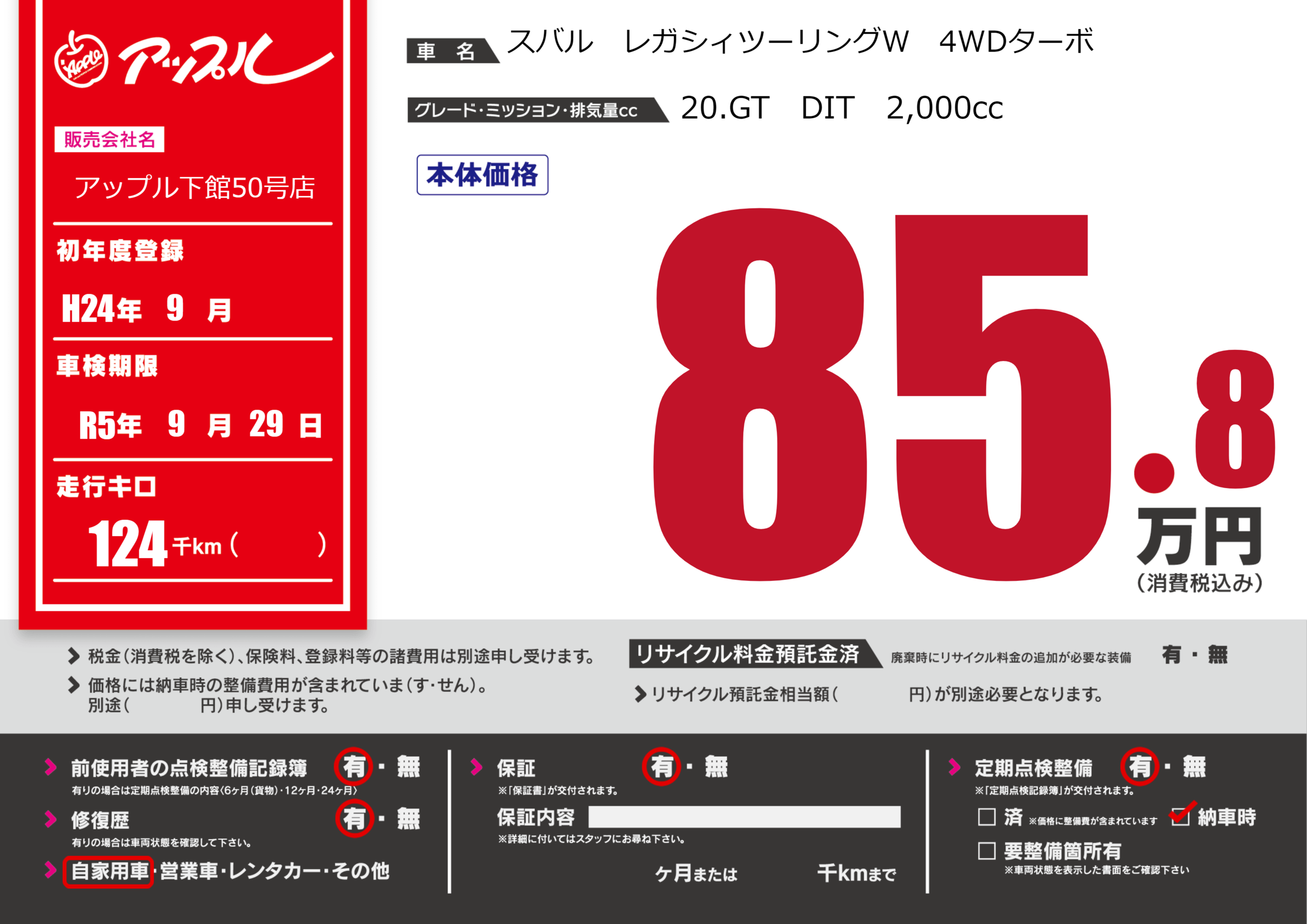 | 車名 | スバル レガシィツーリングW 4WDターボ | グレード ミッション 排気量 |