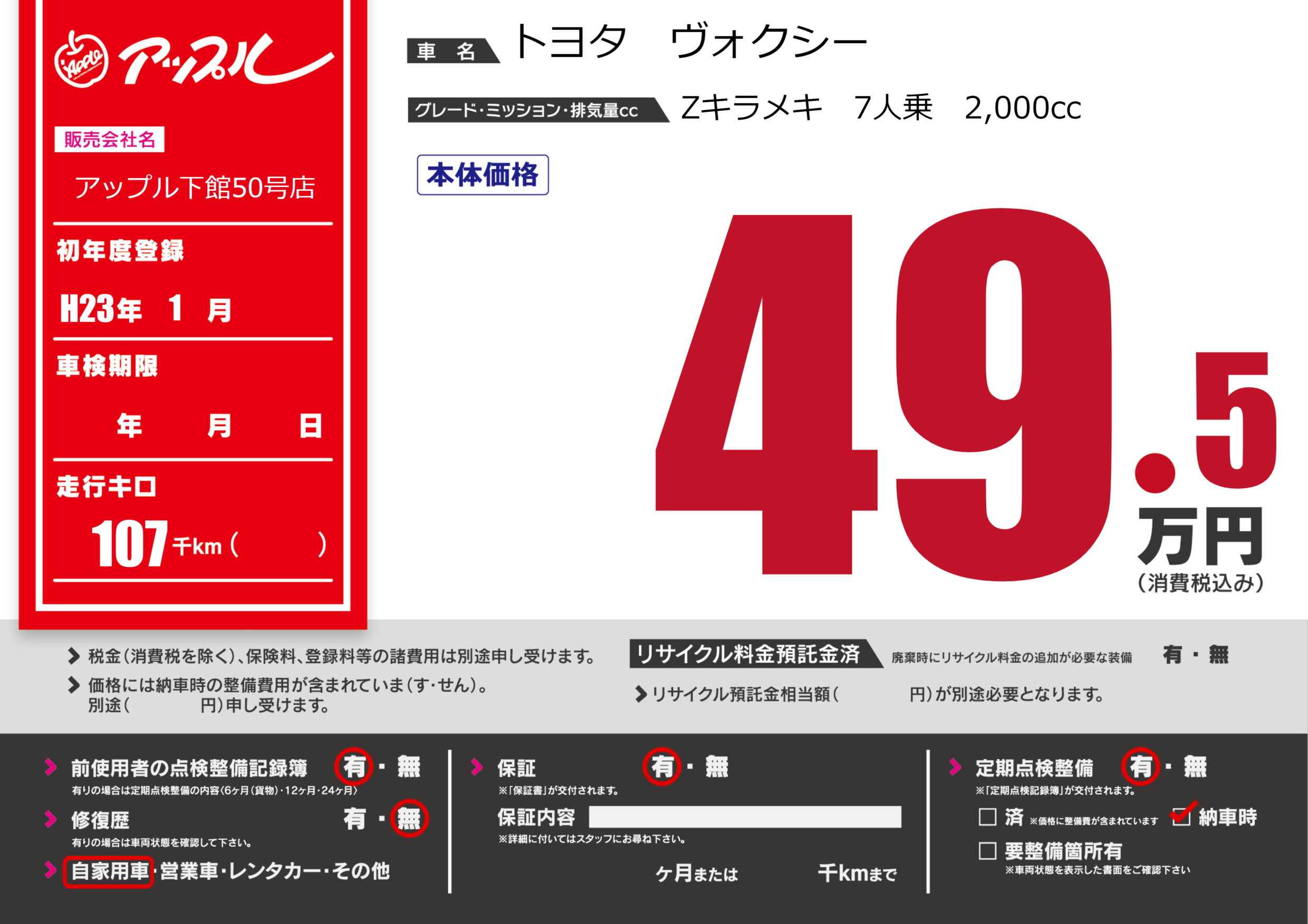 | 走行キロ | 10.7万km | 初年度登録 | H23年1月 |
