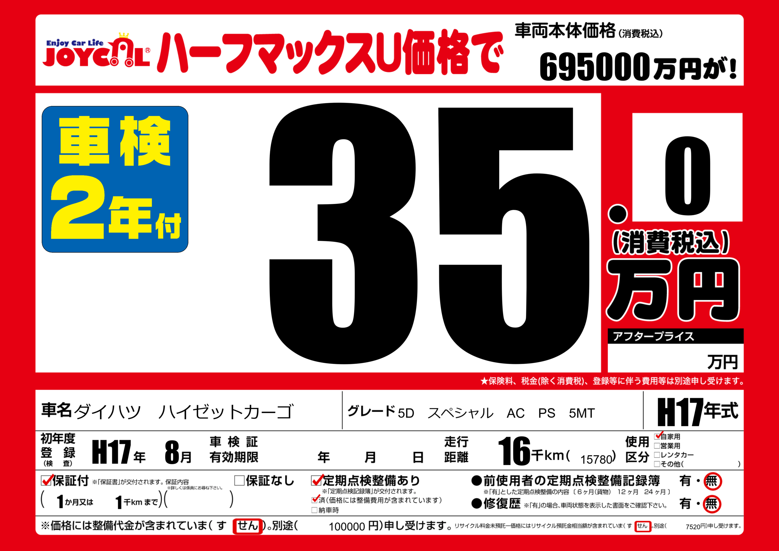 | 定期点検整備 | 定期点検整備あり 定期点検整備済み | ||