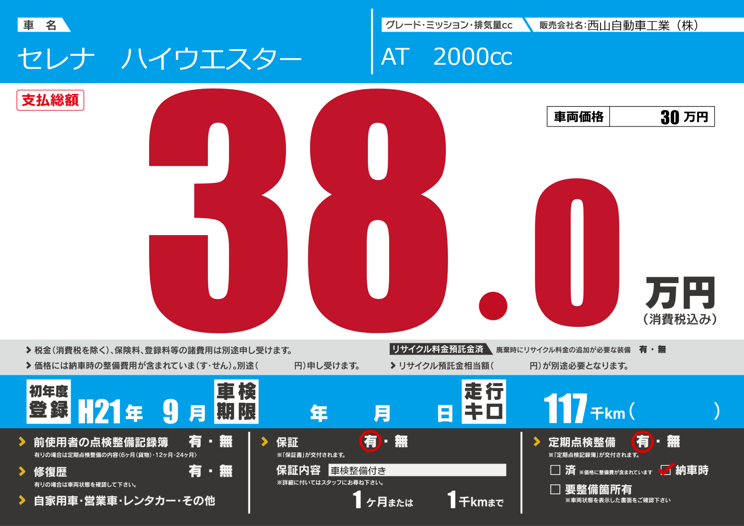 | 定期点検整備 | 定期点検整備あり 納車時あり | ||