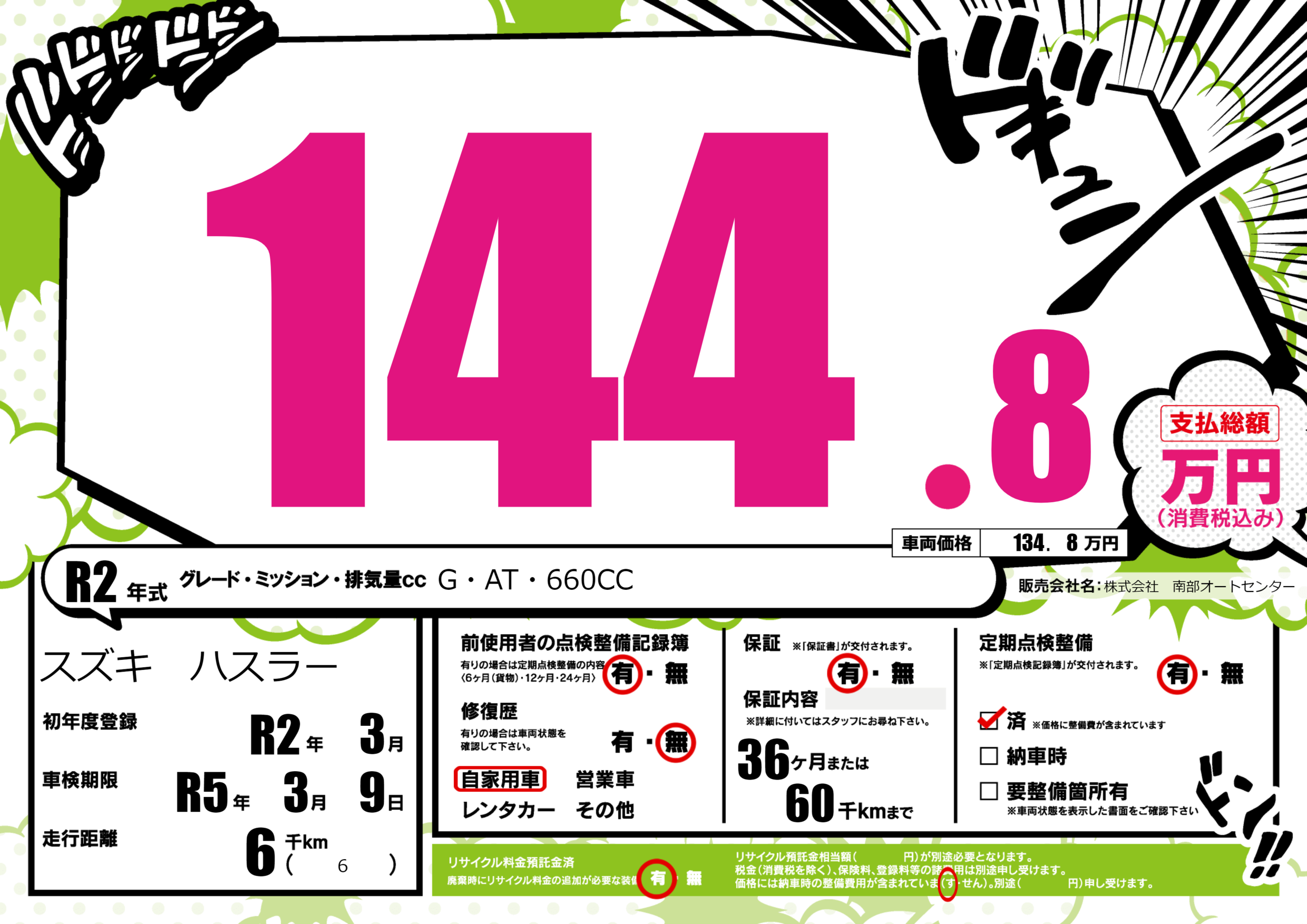 | 車名 | スズキ ハスラー | グレード ミッション 排気量 |
