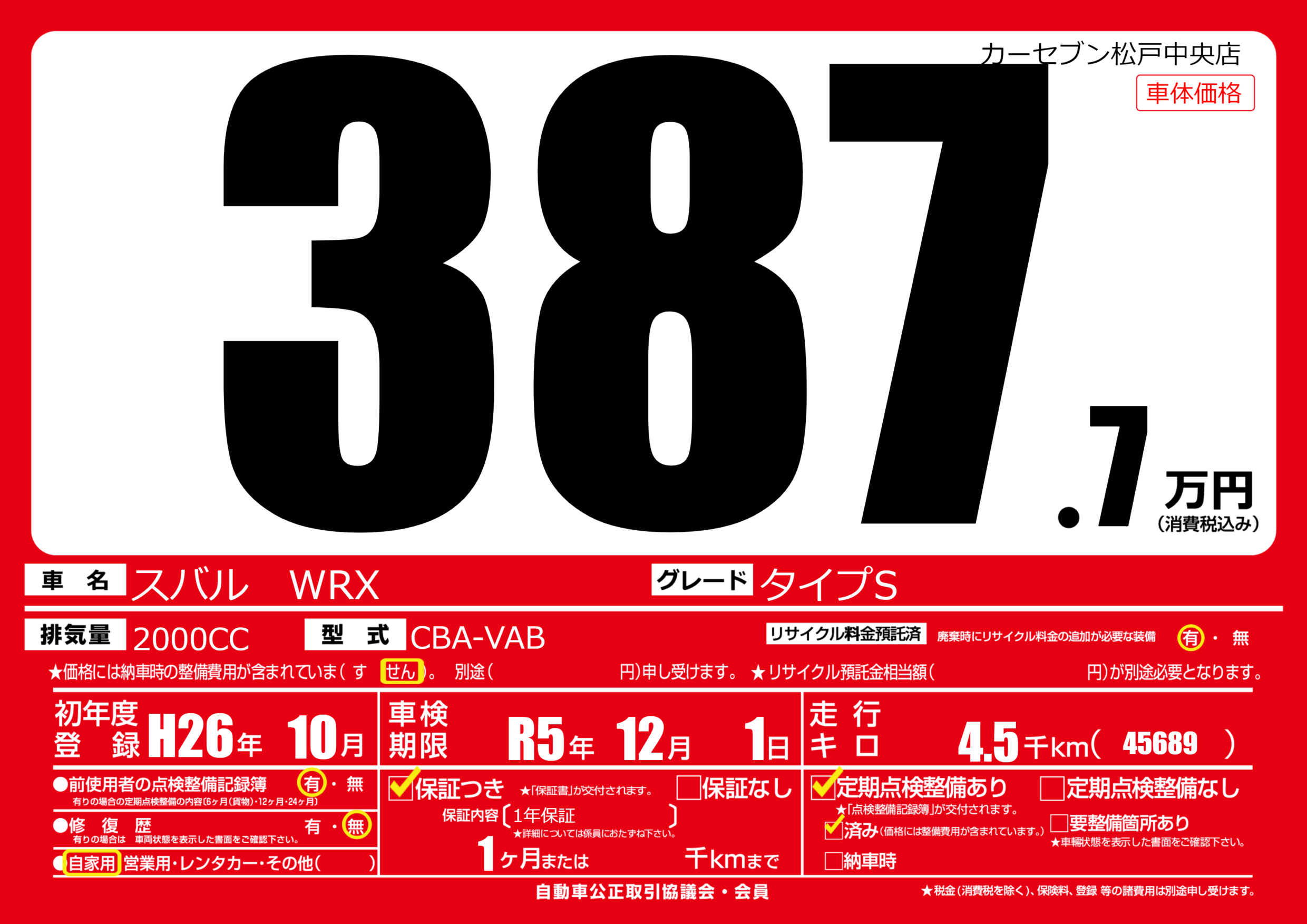 | 車名 | スバル WRX | グレード ミッション 排気量 |