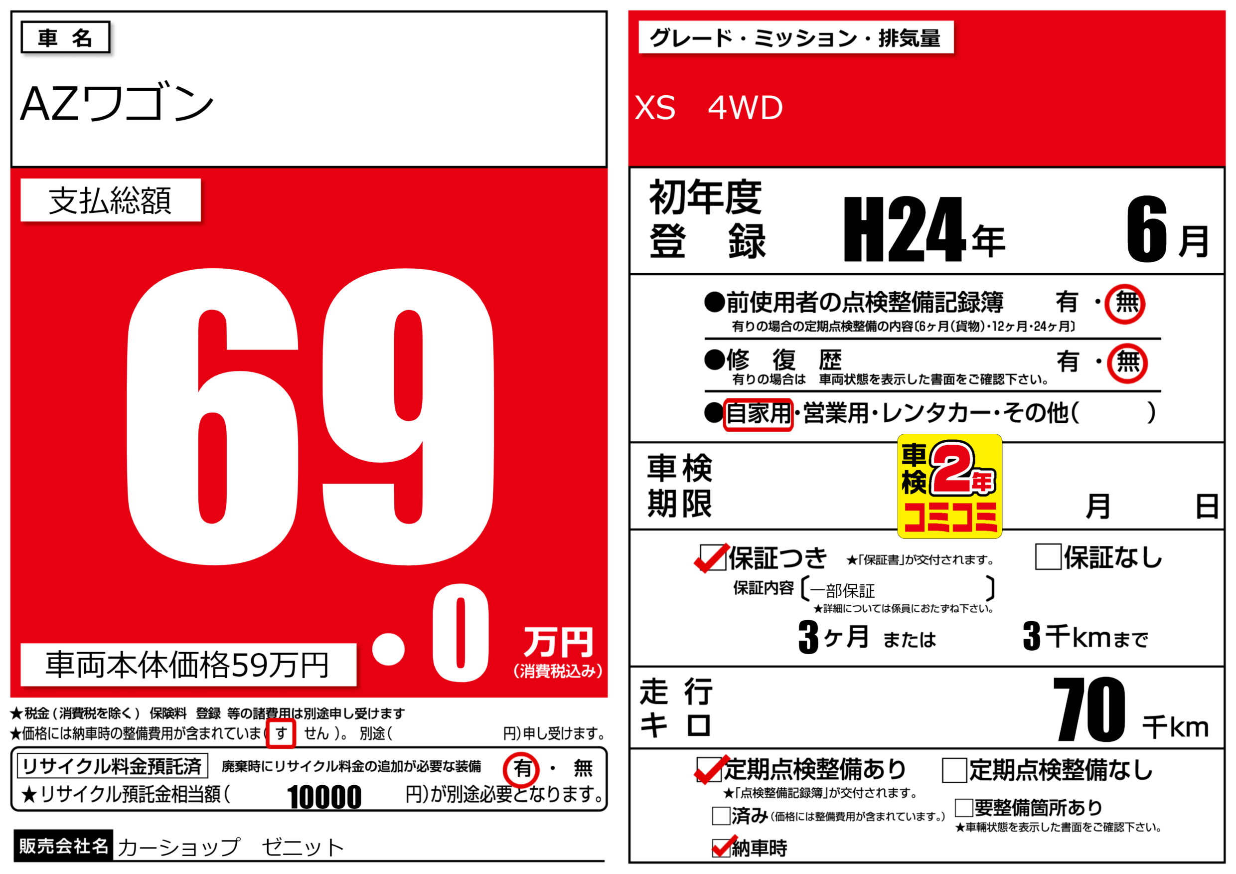 | 定期点検整備 | 定期点検整備あり 納車時あり | ||