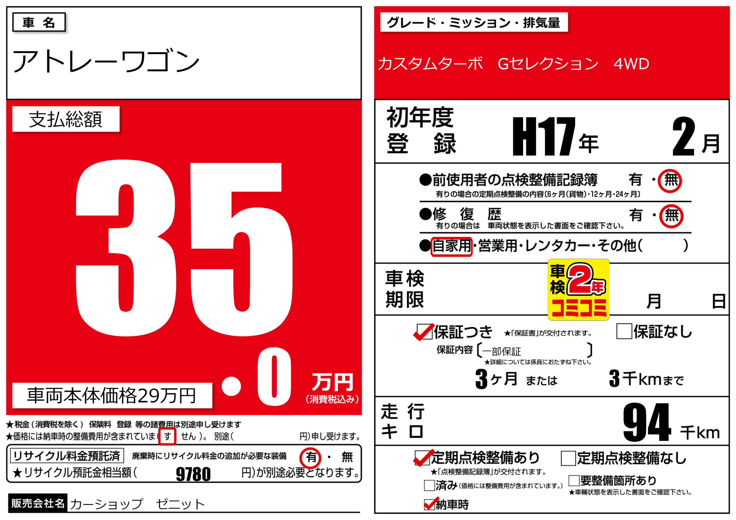 | 走行キロ | 9.4万km | 初年度登録 | H17年2月 |