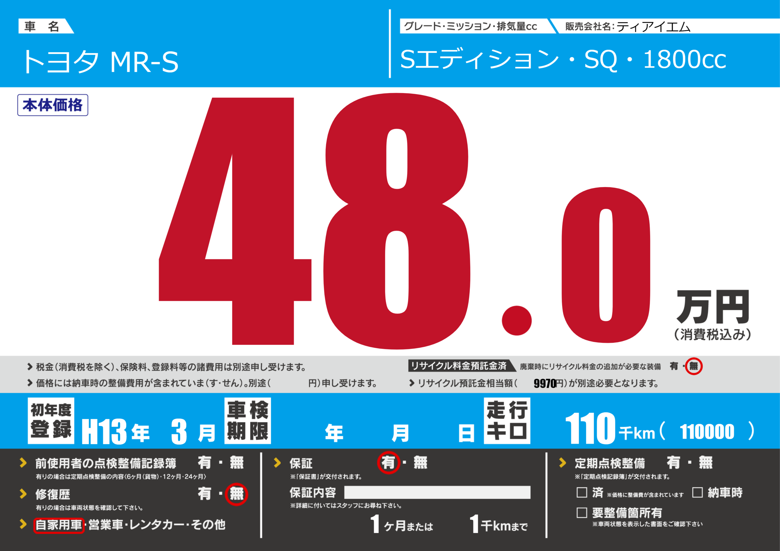 | 車名 | トヨタ MR-S | グレード ミッション 排気量 |