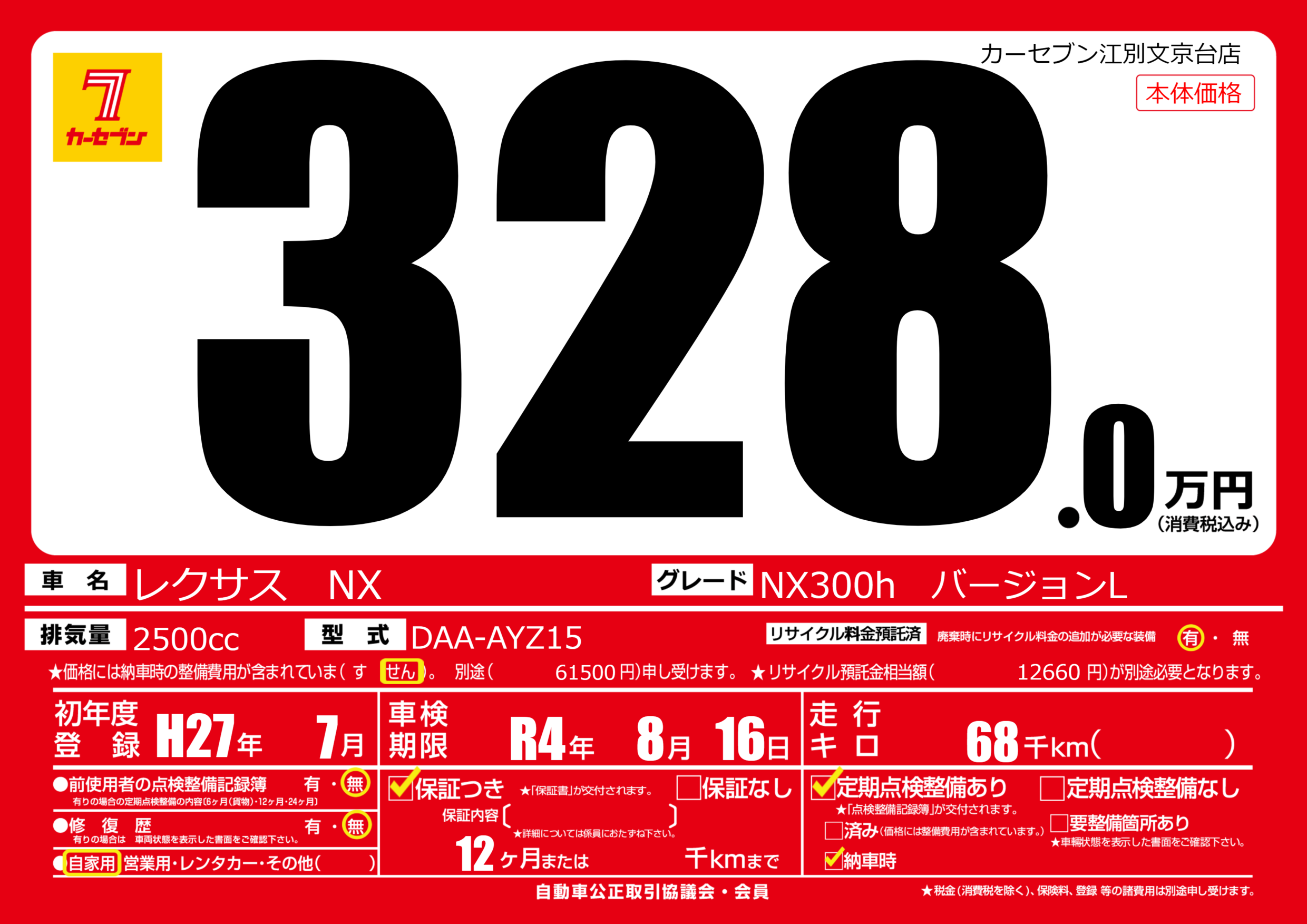 | 車名 | レクサス NX | グレード ミッション 排気量 |