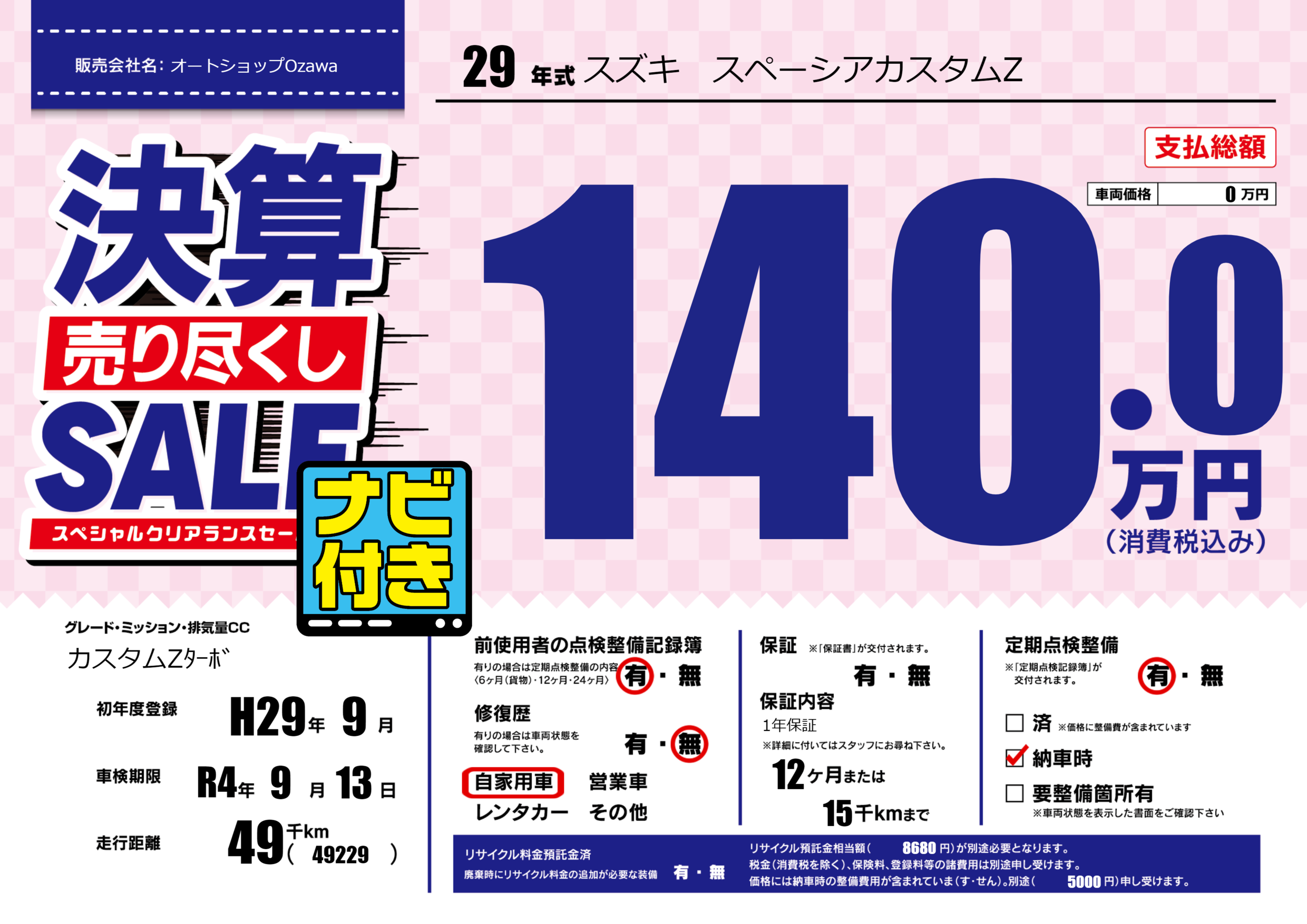 | 走行キロ | 4.9万km | 初年度登録 | H29年9月 |