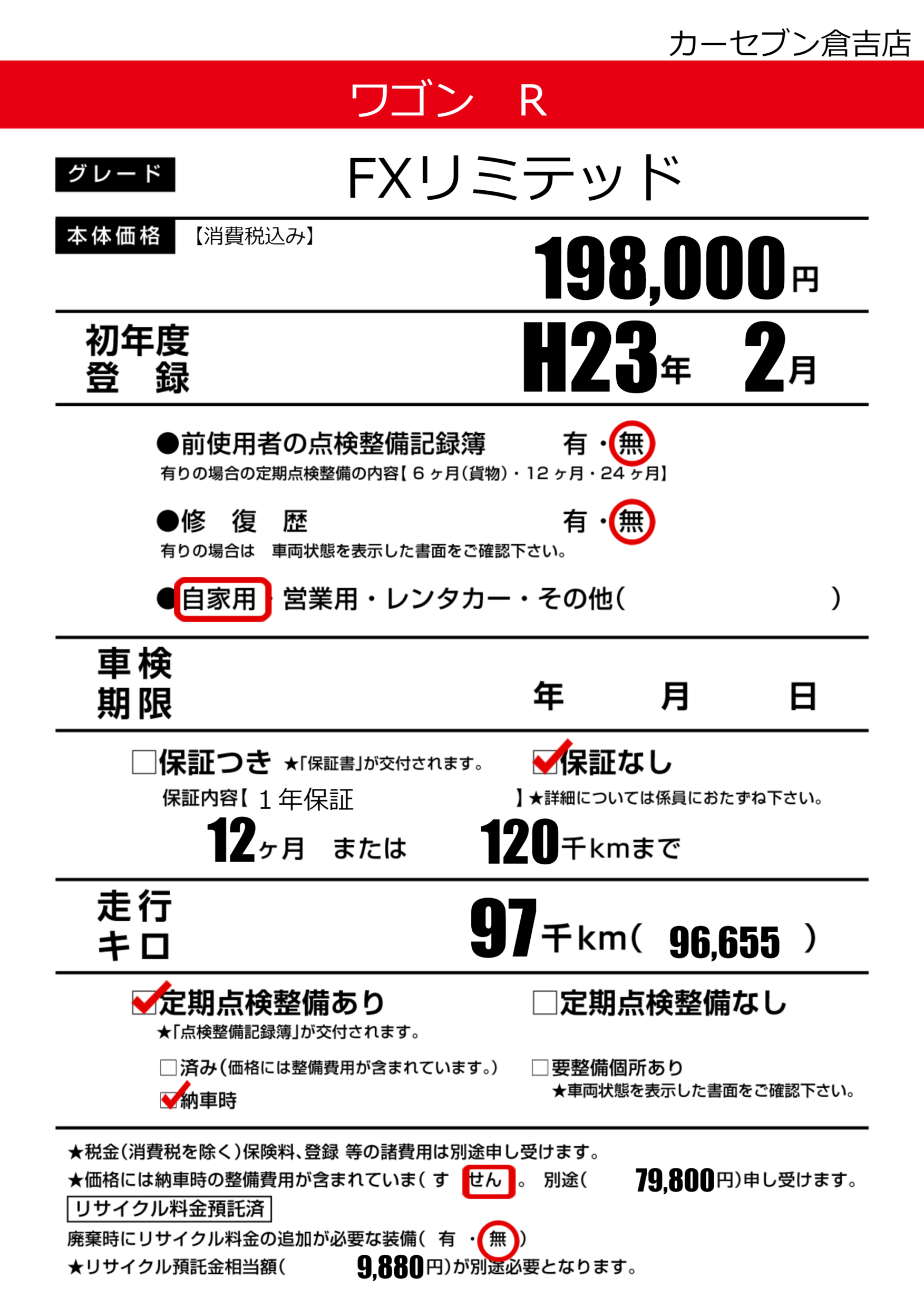 | 走行キロ | 9.7万km | 初年度登録 | H23年2月 |