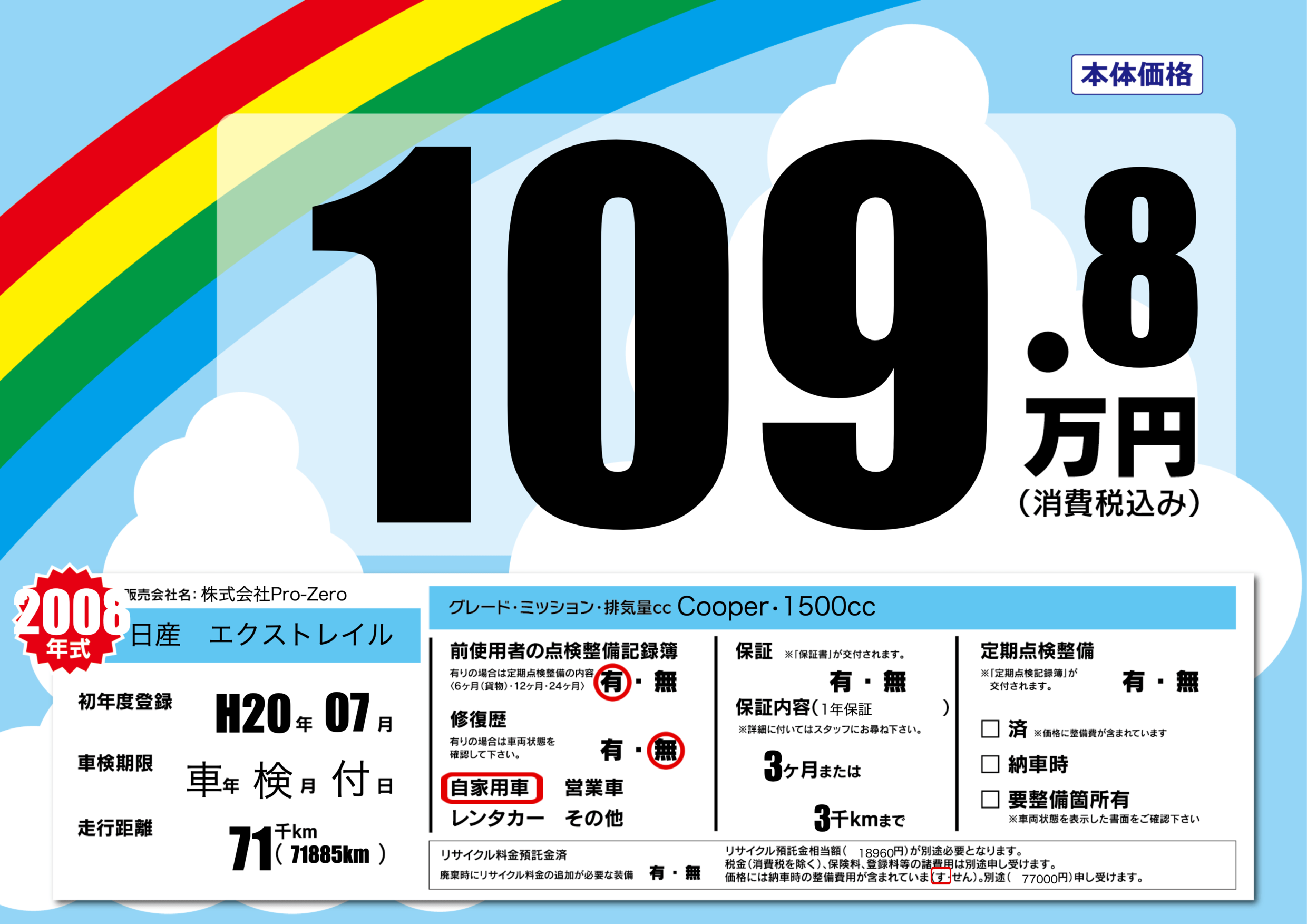 | 走行キロ | 7.1万km | 初年度登録 | H20年07月 |