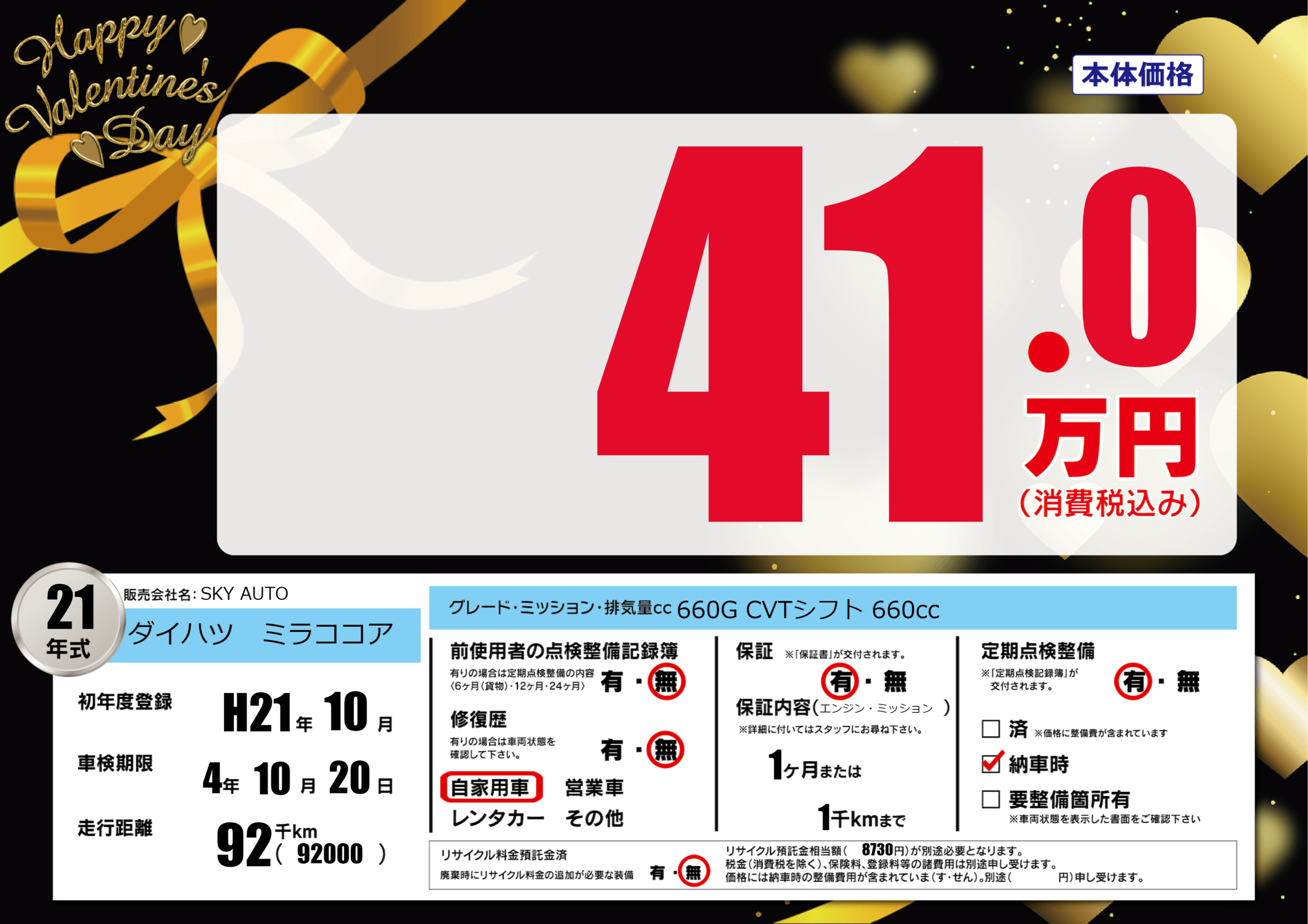 | 走行キロ | 9.2万km | 初年度登録 | H21年10月 |