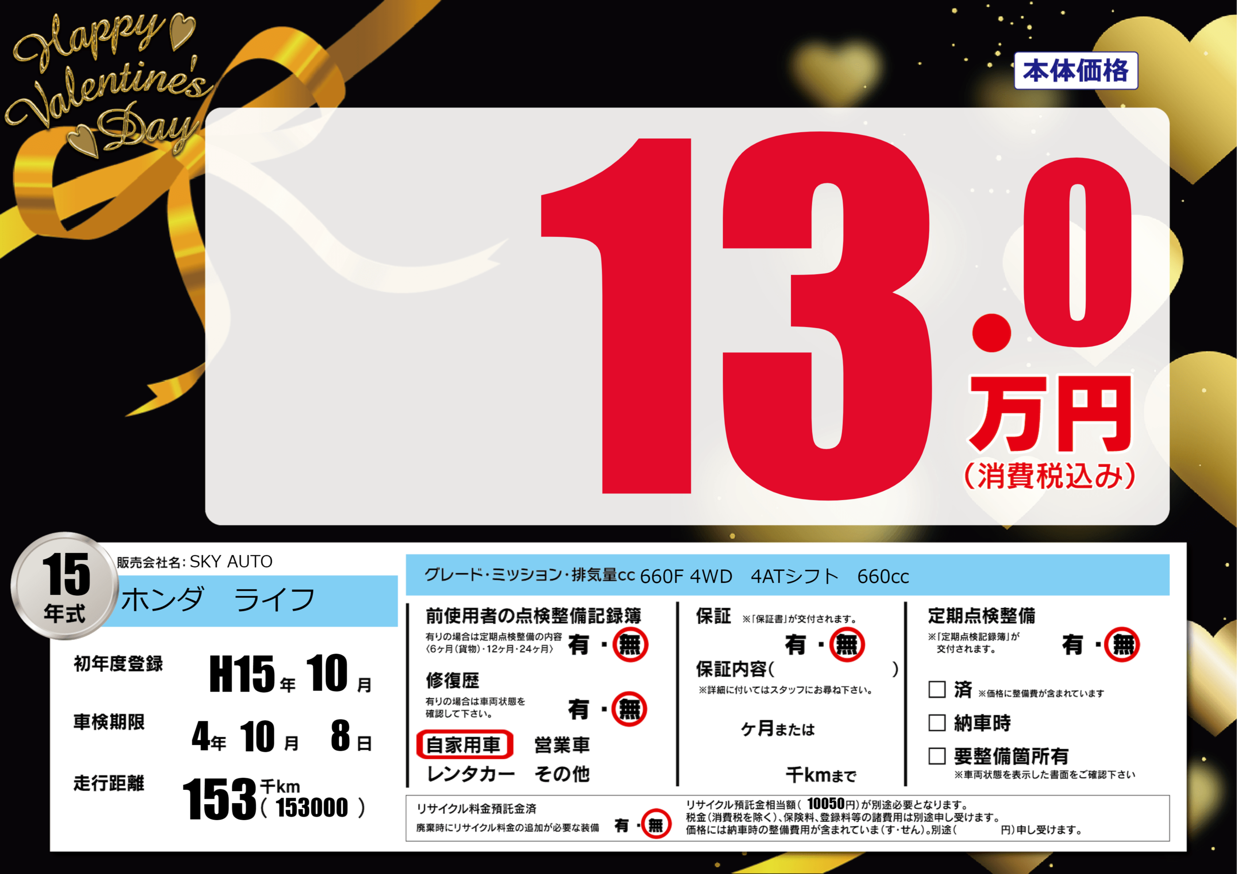 | 走行キロ | 15.3万km | 初年度登録 | H15年10月 |