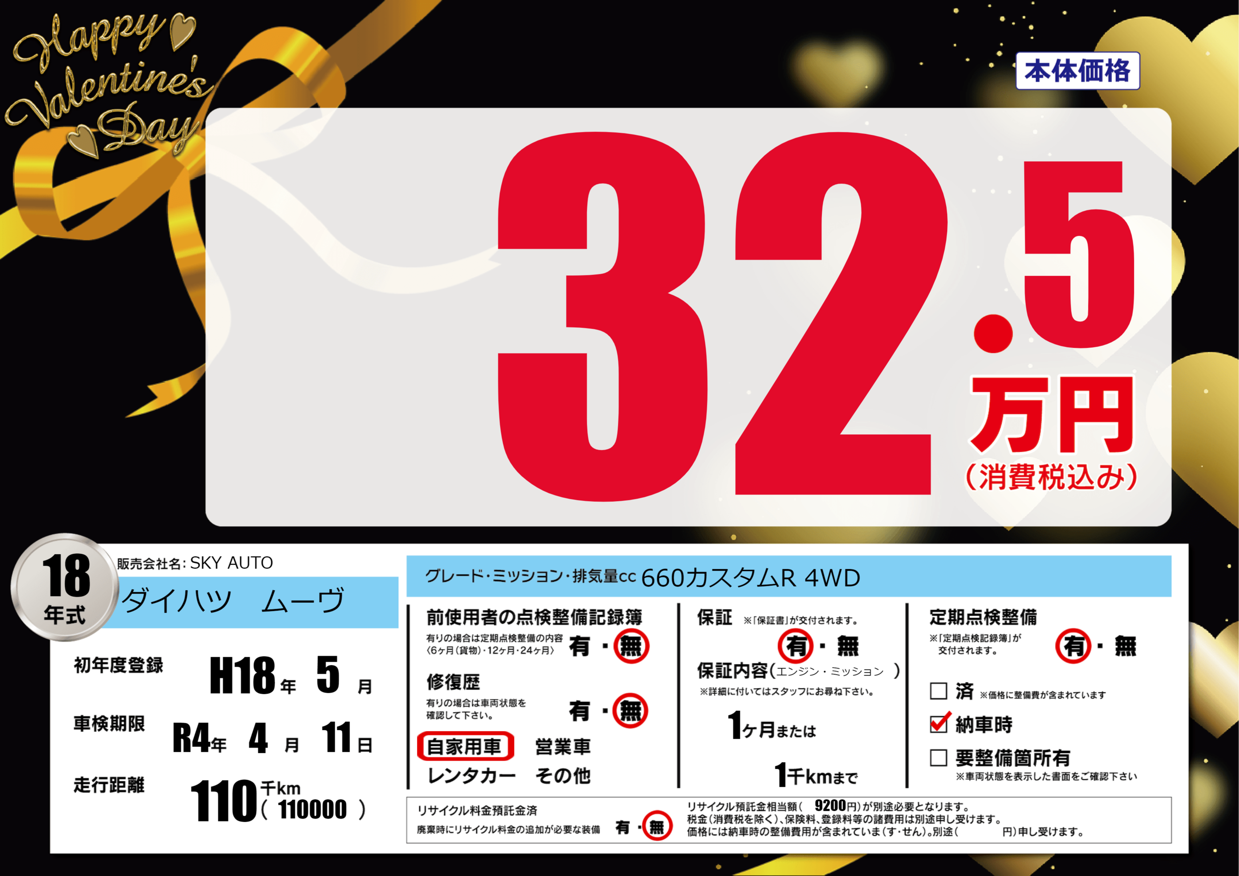 | 走行キロ | 11万km | 初年度登録 | H18年5月 |