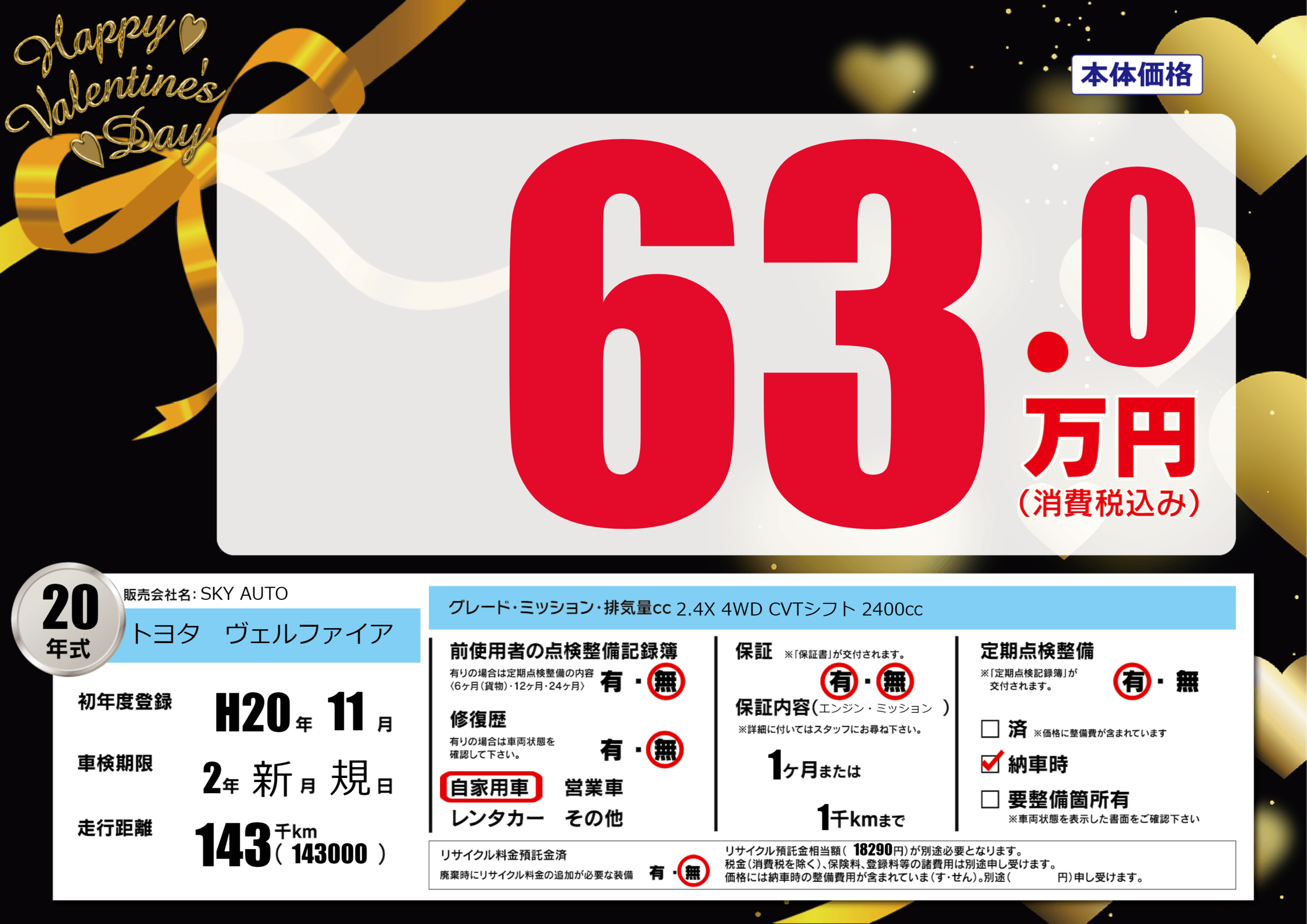 | 車名 | トヨタ ヴェルファイア | グレード ミッション 排気量 |