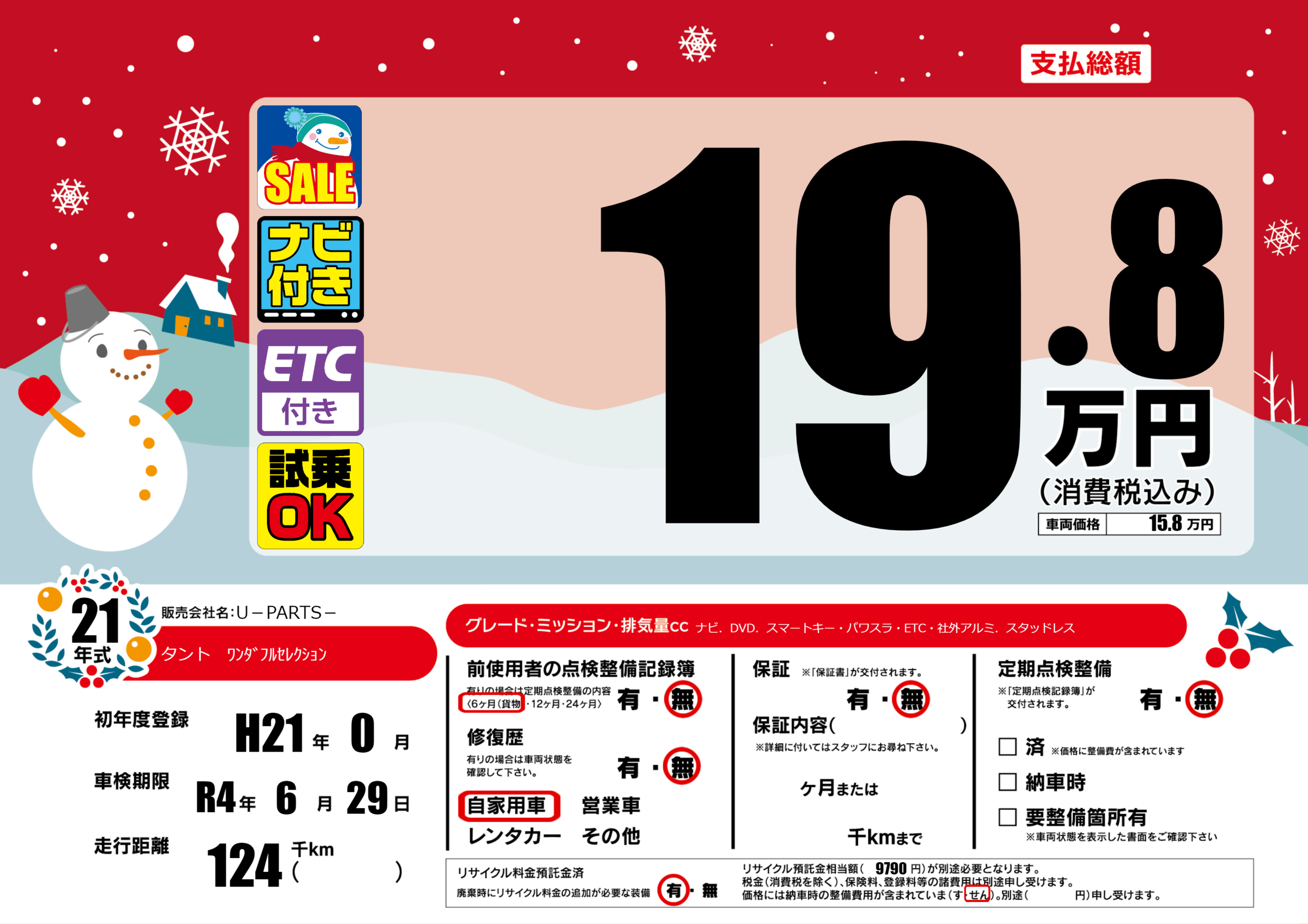| 車名 | タント ワンダフルセレクション | グレード ミッション 排気量 |