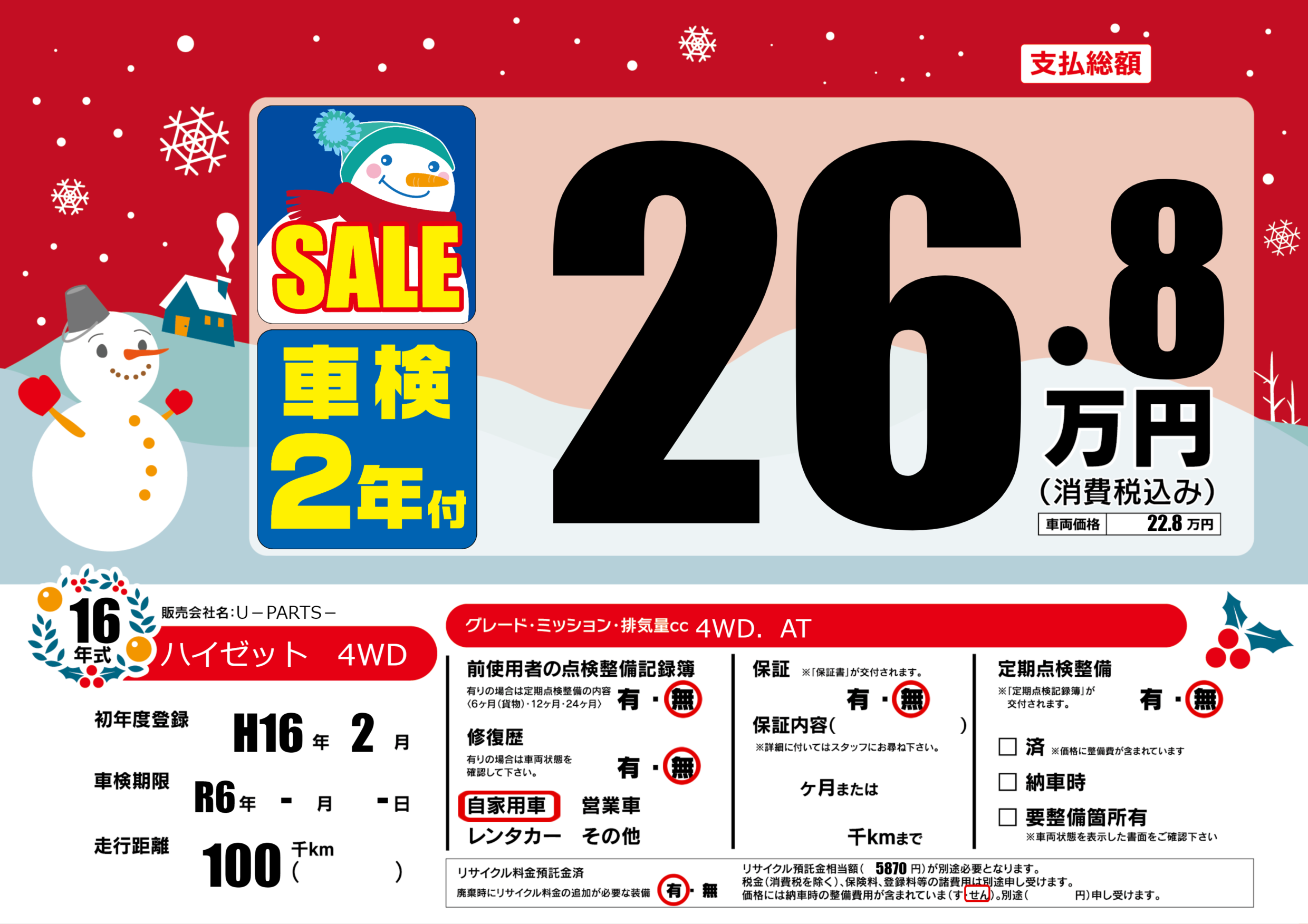 | 車名 | ハイゼット 4WD | グレード ミッション 排気量 |