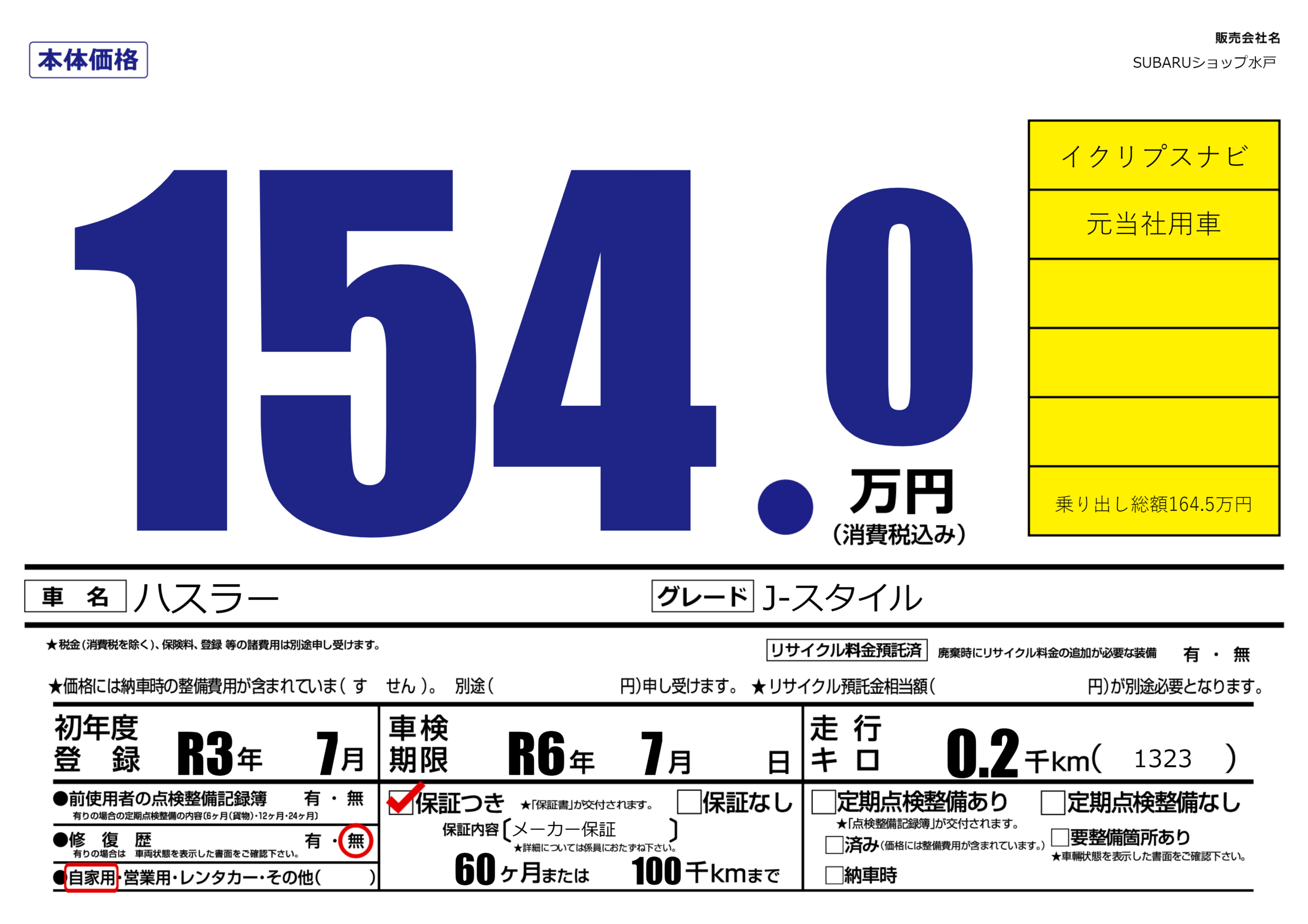 | 車名 | ハスラー | グレード ミッション 排気量 |