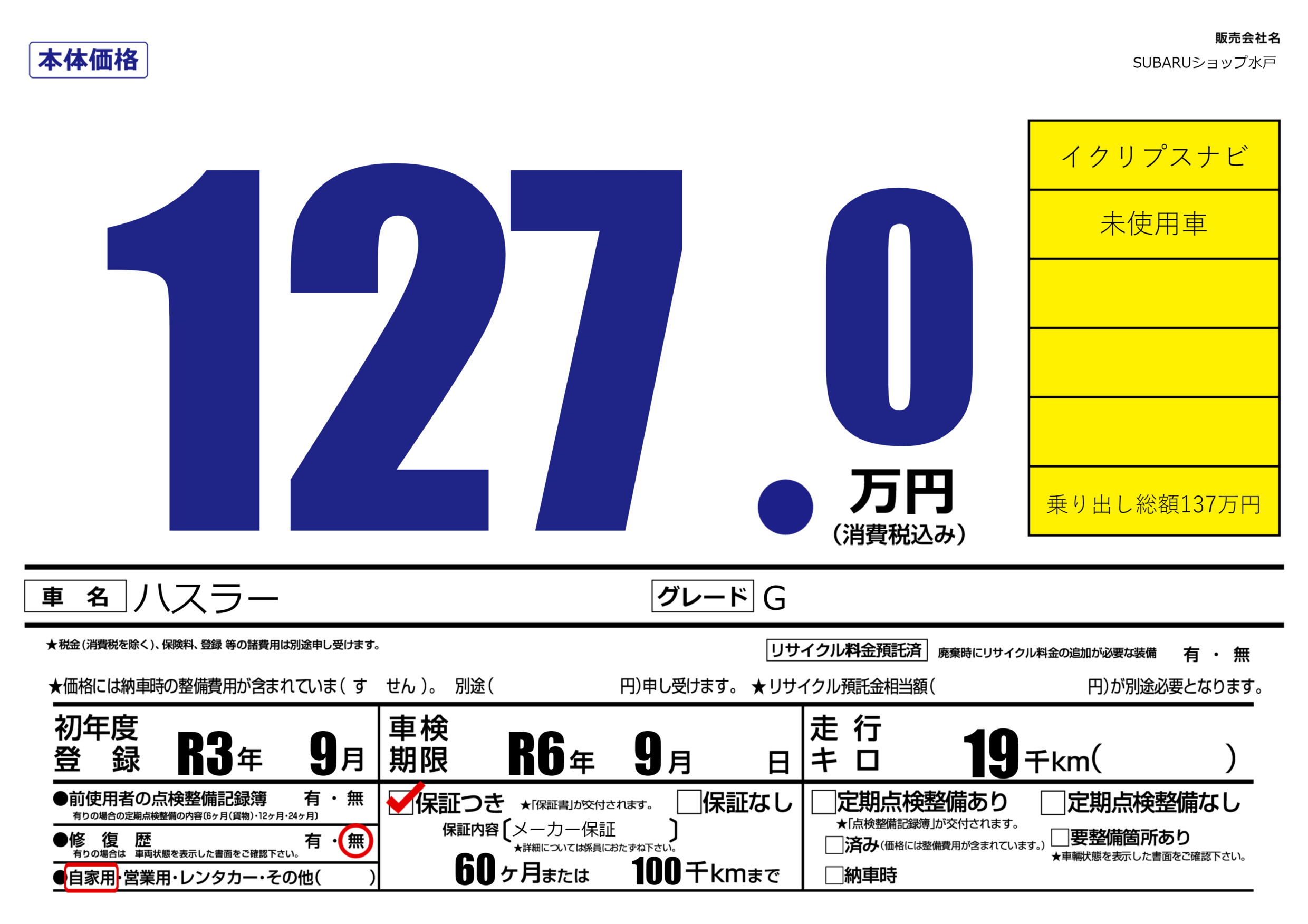 | 車名 | ハスラー | グレード ミッション 排気量 |