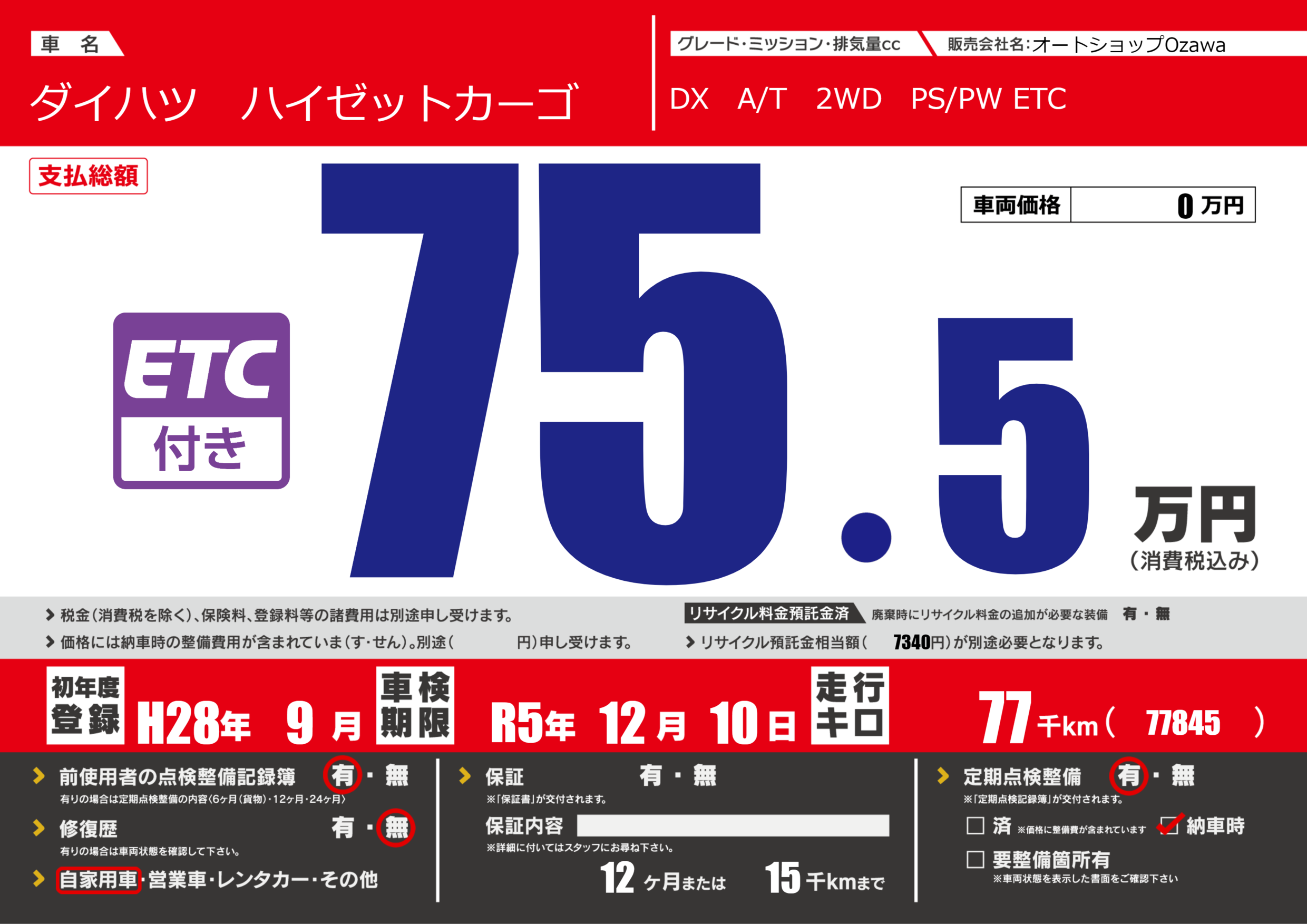 なし | 車検制限 | R5年12月10月 |